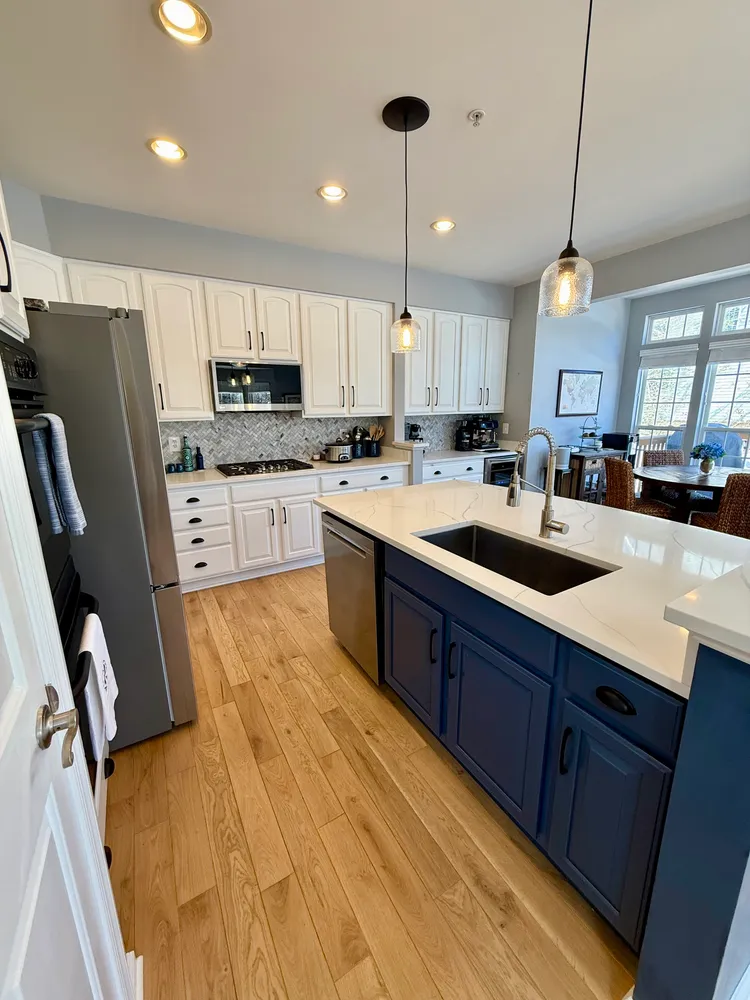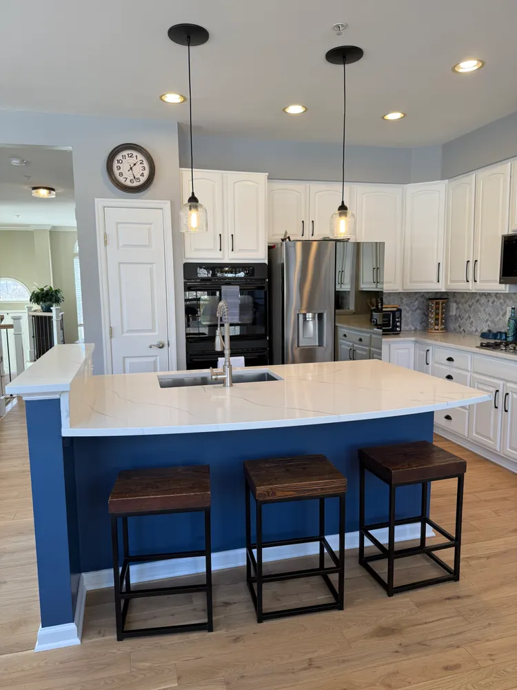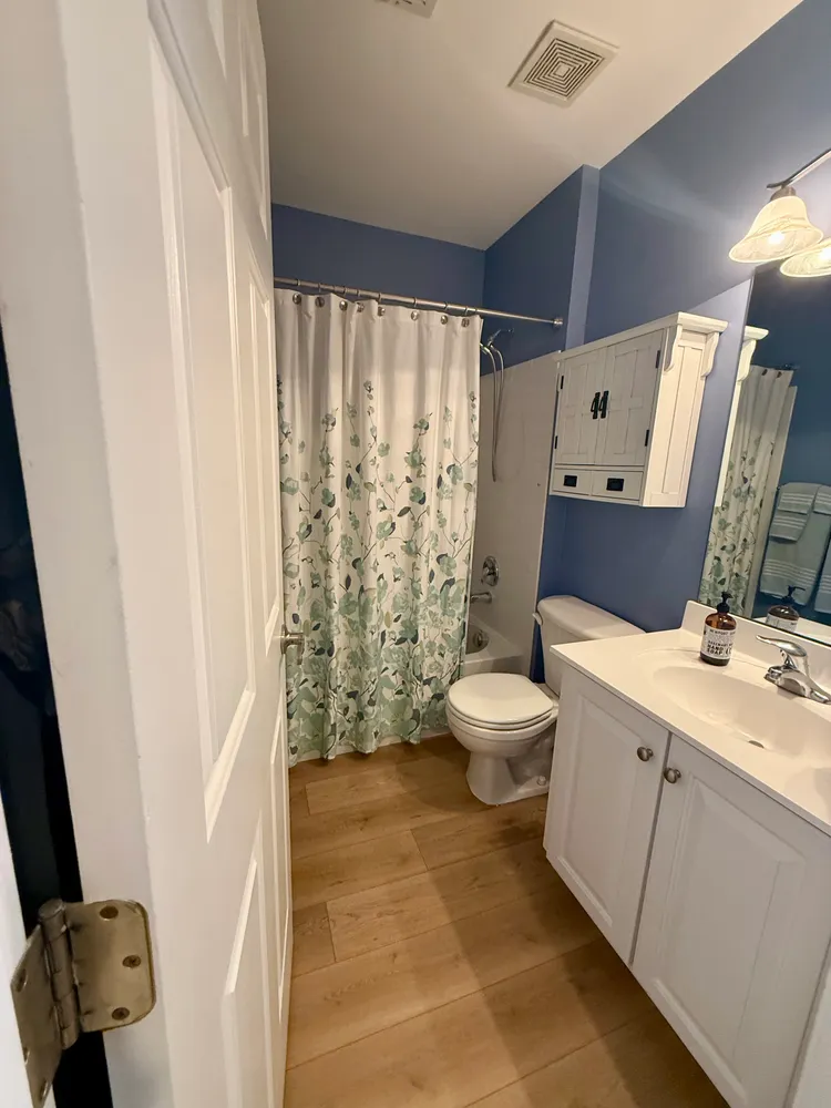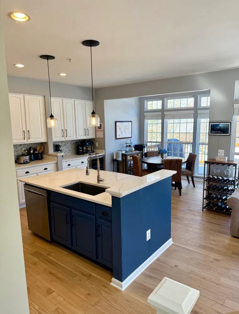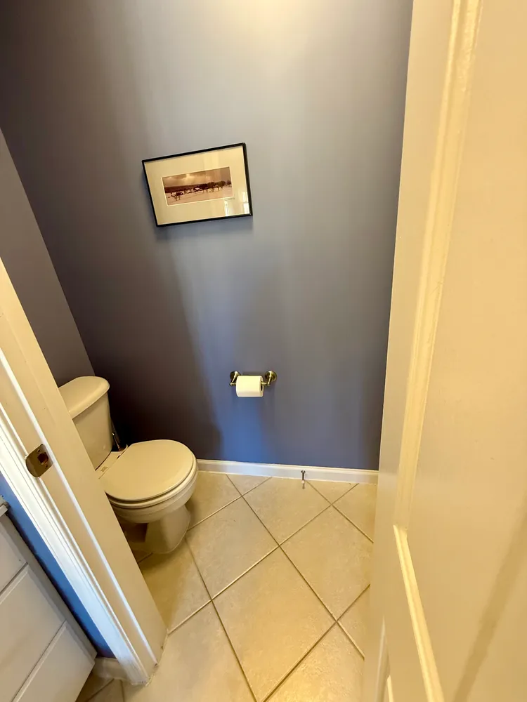 The kitchen is the heart of the home—renovated and designed for real living. Quartz countertops, a fresh backsplash, and crisp white cabinetry are complemented by a striking blue island, while thoughtfully updated appliances, including a new microwave, a newer refrigerator, a newer dishwasher, and updated sink, faucet, and garbage disposal, blend seamlessly into the space. From the kitchen and family room, your eye is drawn outside to the newly built expansive deck and generous rear yard—an easy extension of the living space and a natural spot for morning coffee, dinners outside, or winding down at day’s end. A conveniently located powder room completes this level.
