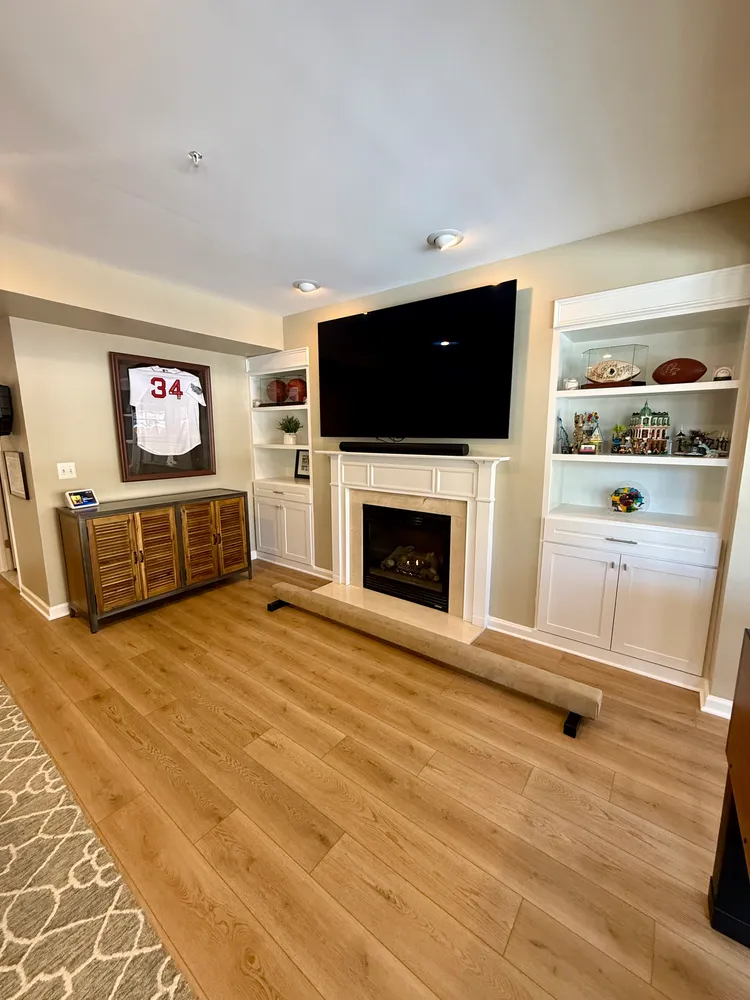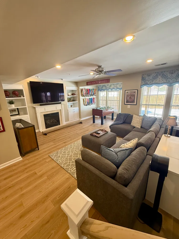 The walk-out lower level feels like a retreat of its own, filled with natural light from walls of windows. Finished in 2025 with luxury vinyl plank flooring, this space centers around a gas fireplace framed by custom built-ins—cozy without feeling closed in. A full bath on this level adds flexibility, and a French door leads directly to the flagstone patio and a fully fenced rear yard that offers more outdoor space than typically found in a townhome setting—ideal for entertaining, play, or a green-thumb mix of herbs and flowers.