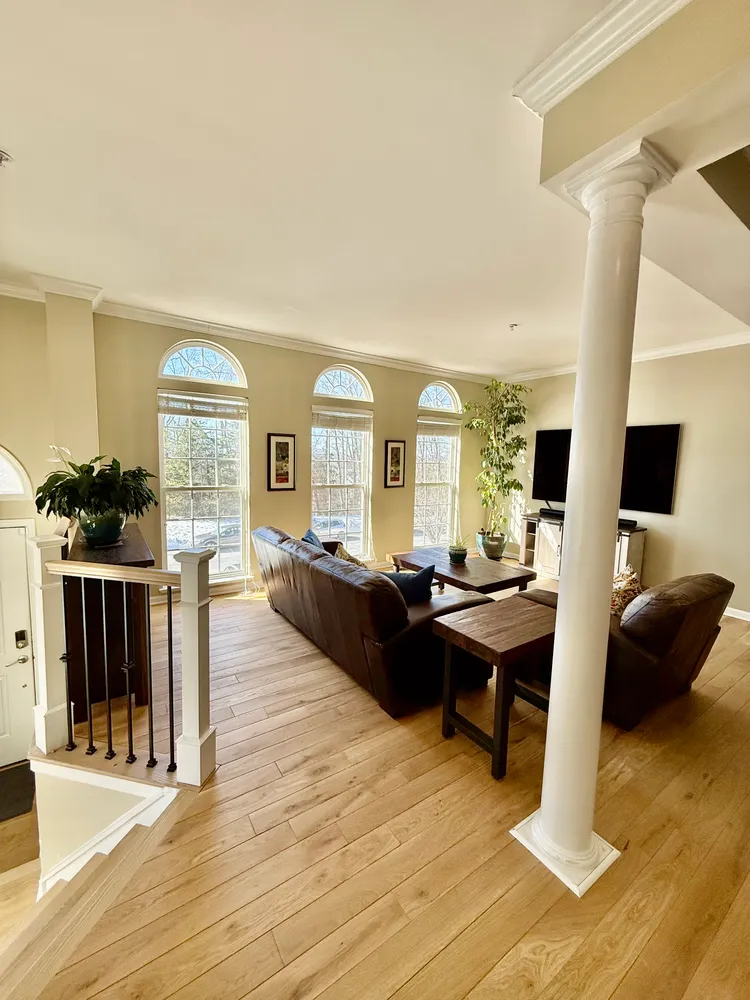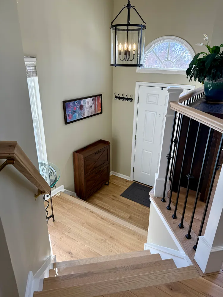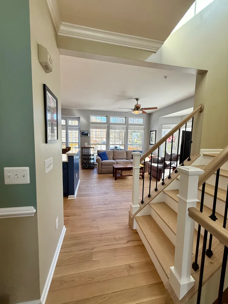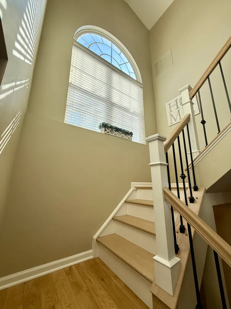 From the foyer, a few steps lead you into the main living level, where the home immediately opens up. Nearly floor-to-ceiling arched windows line the front of the house, letting the afternoon sun pour in and setting a warm, inviting tone. In 2024, new Canadian white oak hardwood floors were added throughout this level and continue up the stairs to the bedroom level, paired with new hand railings and wrought-iron balusters that add a refined, architectural touch. A large Palladian window along the stairway further enhances the light-filled feel, keeping the entire home bright and open.