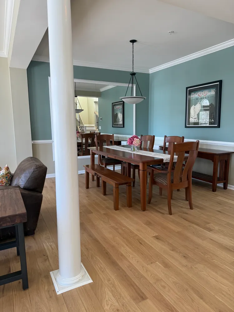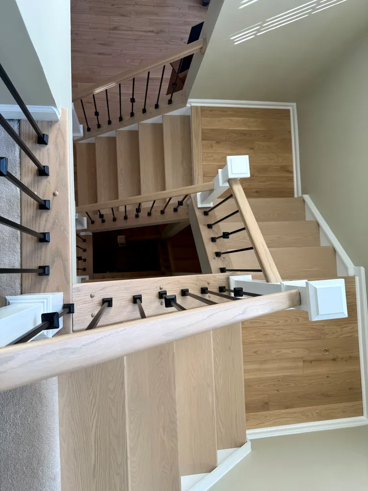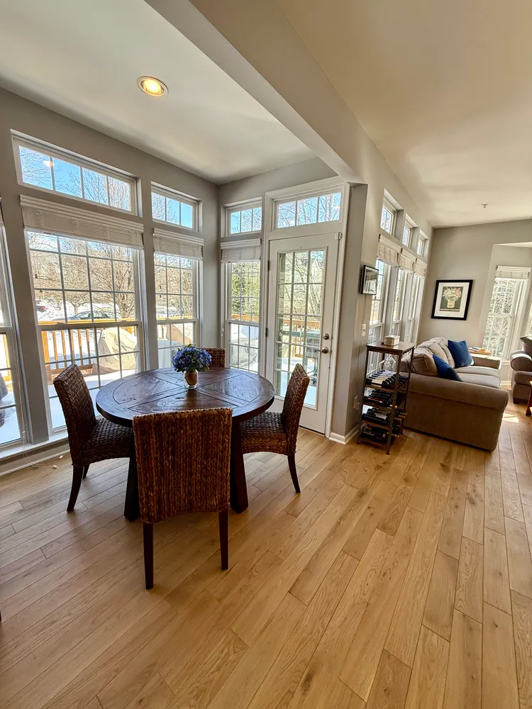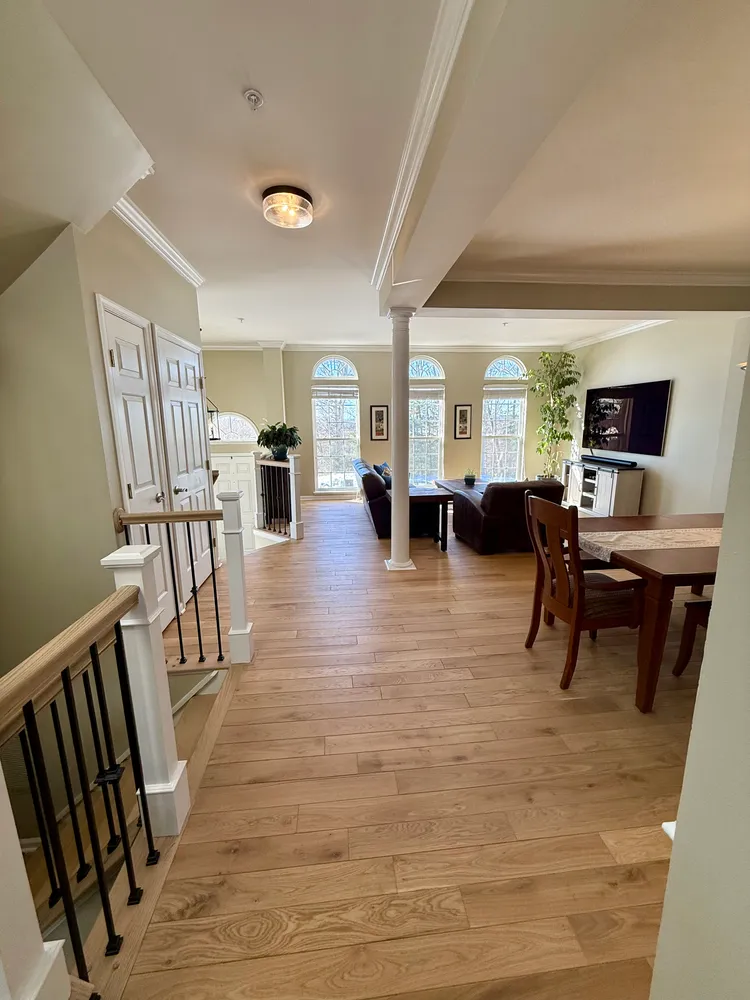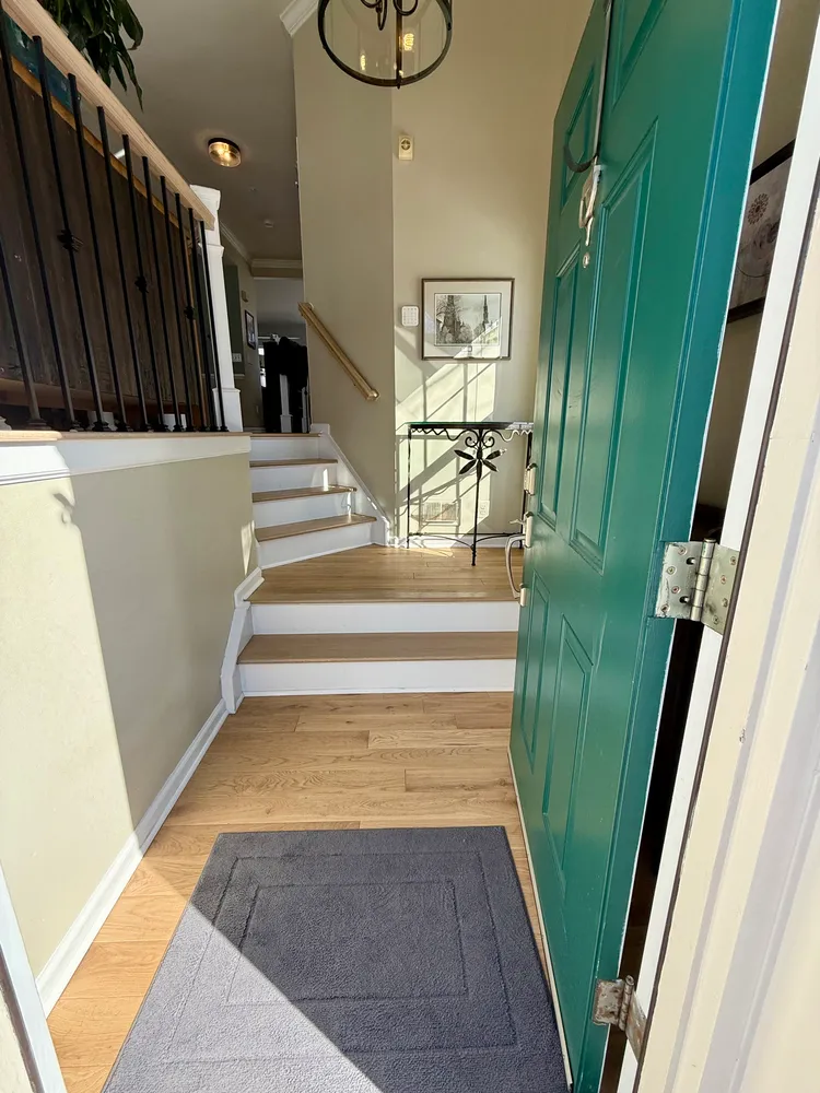 From the foyer, a few steps lead you into the main living level, where the home immediately opens up. Nearly floor-to-ceiling arched windows line the front of the house, letting the afternoon sun pour in and setting a warm, inviting tone. In 2024, new Canadian white oak hardwood floors were added throughout this level and continue up the stairs to the bedroom level, paired with new hand railings and wrought-iron balusters that add a refined, architectural touch. A large Palladian window along the stairway further enhances the light-filled feel, keeping the entire home bright and open.