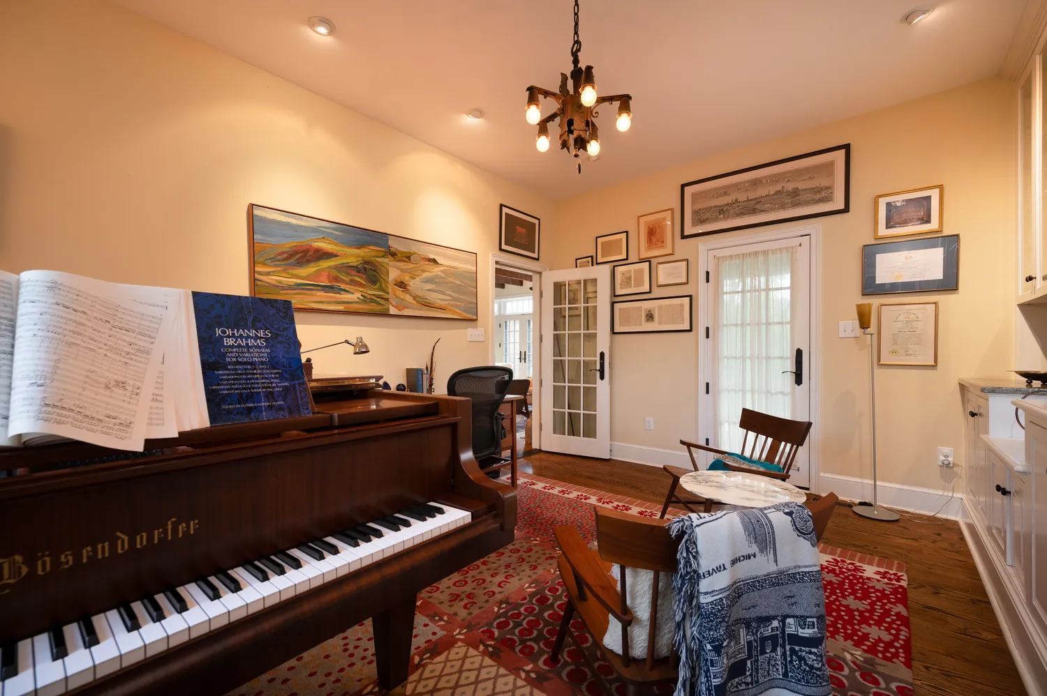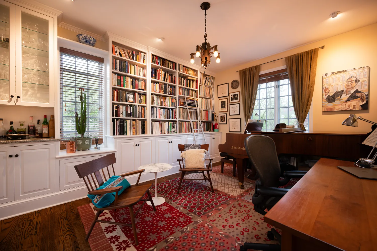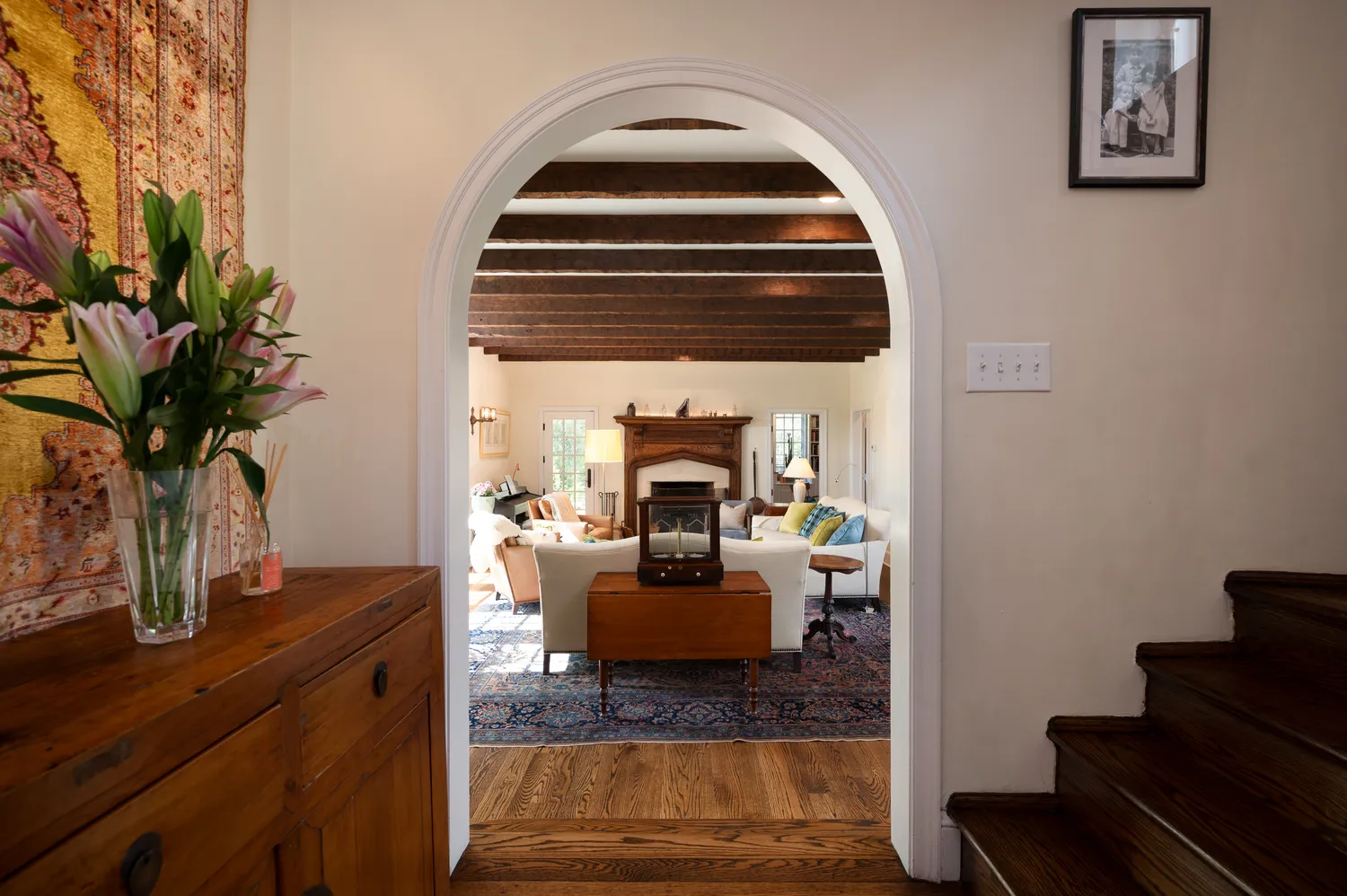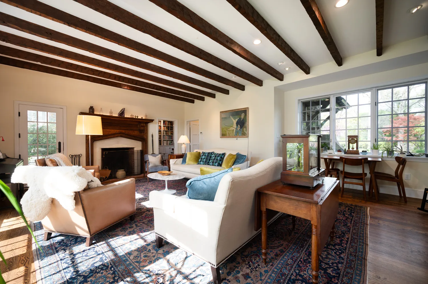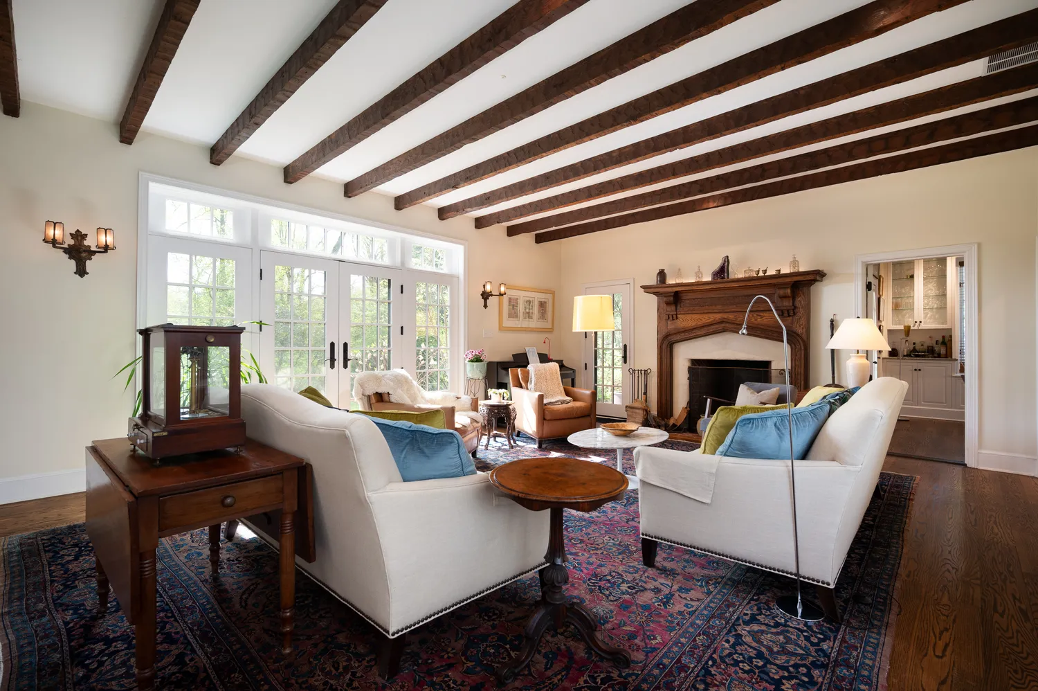 Back through the foyer, the home’s expansive living room awaits. With its wood-burning fireplace, exposed original beams, and impressive scale, this space is equally suited for intimate evenings or larger gatherings. A standout feature here is the pair of private offices—each with its own exterior access—offering flexibility for work, creativity, or retreat. One office is large enough to accommodate a grand piano and features built-in bookcases and direct access to an additional covered patio.