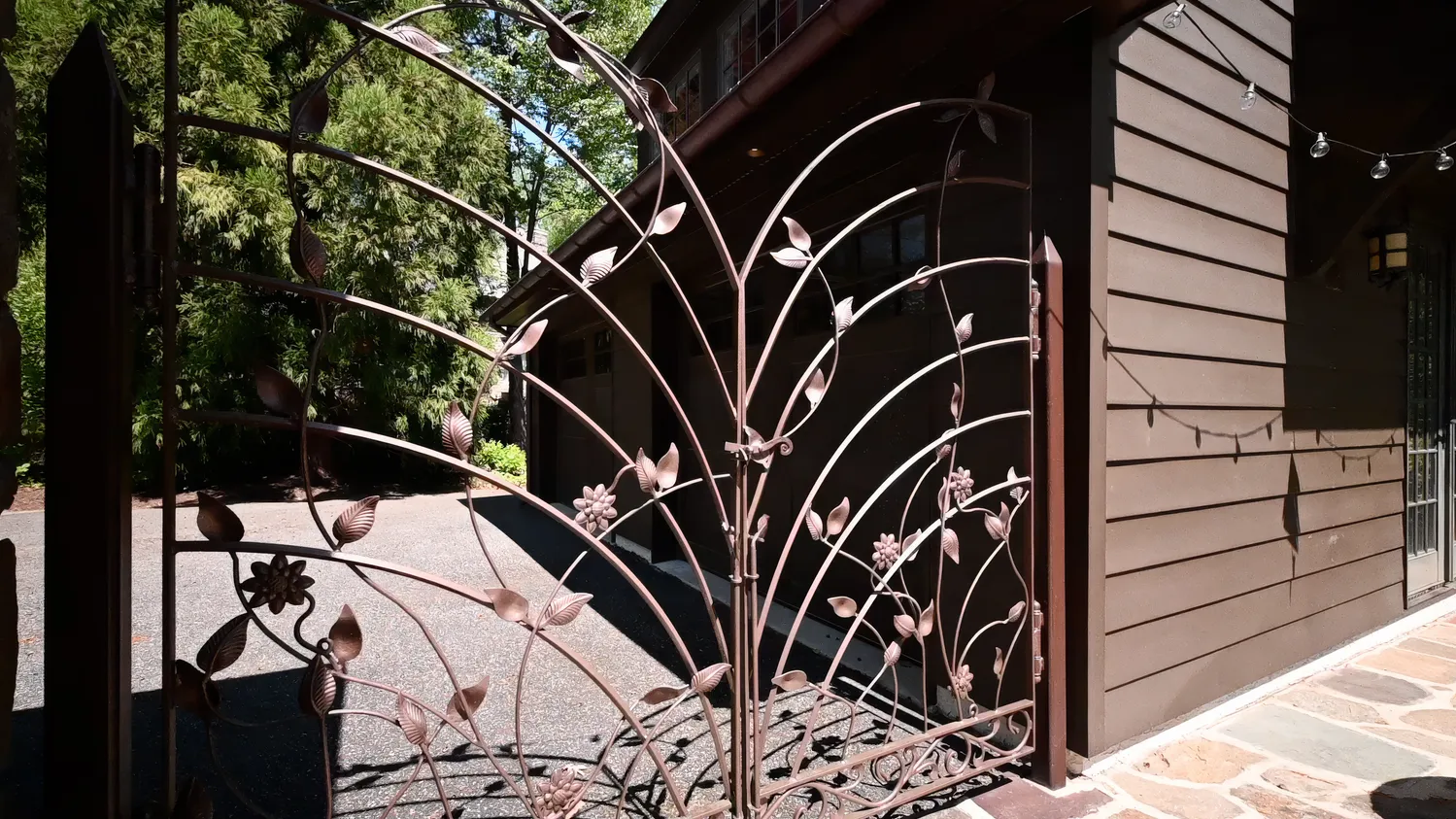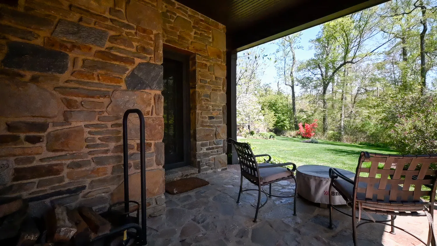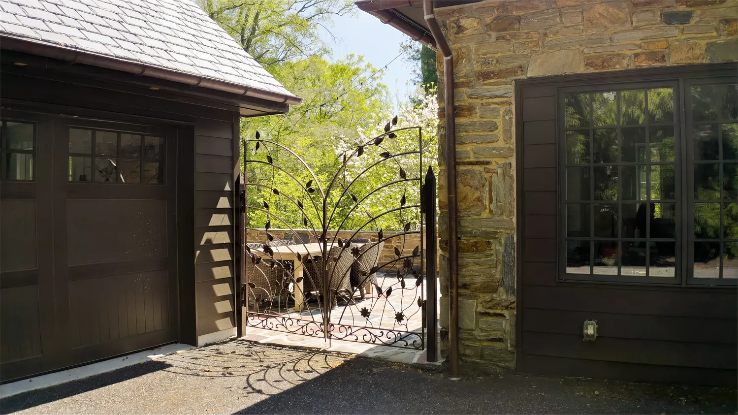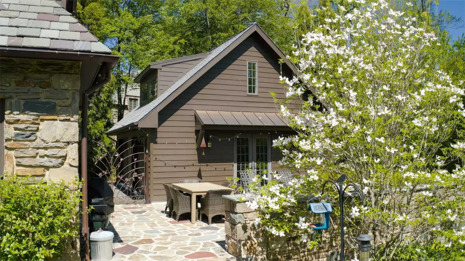 Set on 1.8 acres, the grounds are as captivating as the home itself. From the fully replaced slate roof to unique architectural details like a charming “bottle glass” window, the exterior continues to impress. A custom wrought iron gate—designed by the owners and crafted by local artisan Eric Zandotti—adds a distinctive finishing touch. Two stone patios invite outdoor living: one covered, perfect for enjoying a quiet moment in the rain, and one open for sunny days and entertaining. The expansive yard is framed by flowering trees and lush hydrangeas, creating a private and picturesque setting.