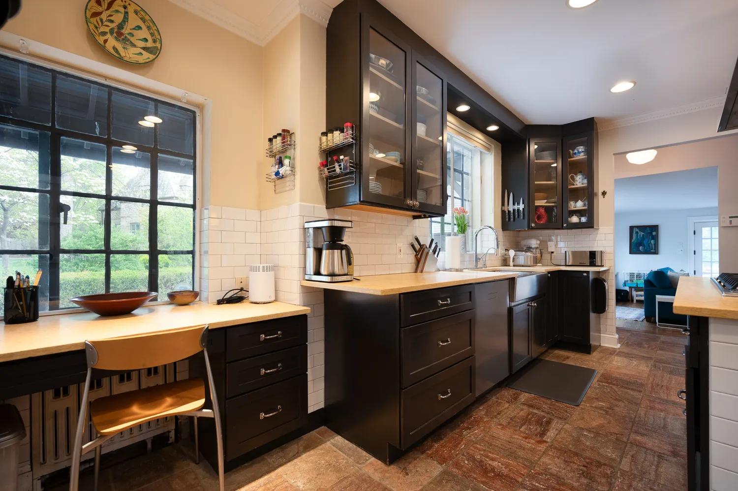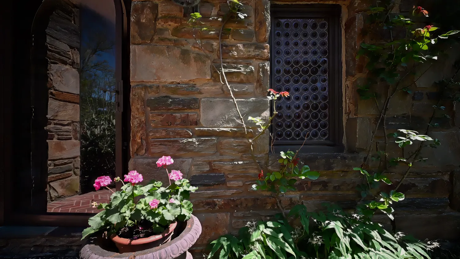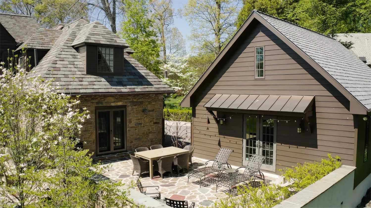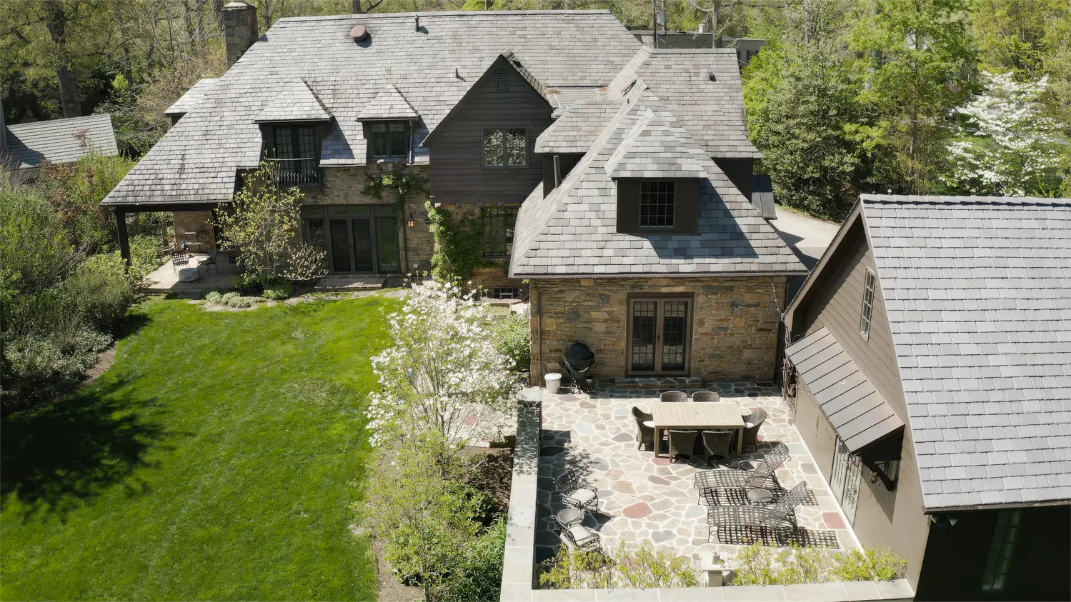 Set on 1.8 acres, the grounds are as captivating as the home itself. From the fully replaced slate roof to unique architectural details like a charming “bottle glass” window, the exterior continues to impress. A custom wrought iron gate—designed by the owners and crafted by local artisan Eric Zandotti—adds a distinctive finishing touch. Two stone patios invite outdoor living: one covered, perfect for enjoying a quiet moment in the rain, and one open for sunny days and entertaining. The expansive yard is framed by flowering trees and lush hydrangeas, creating a private and picturesque setting.