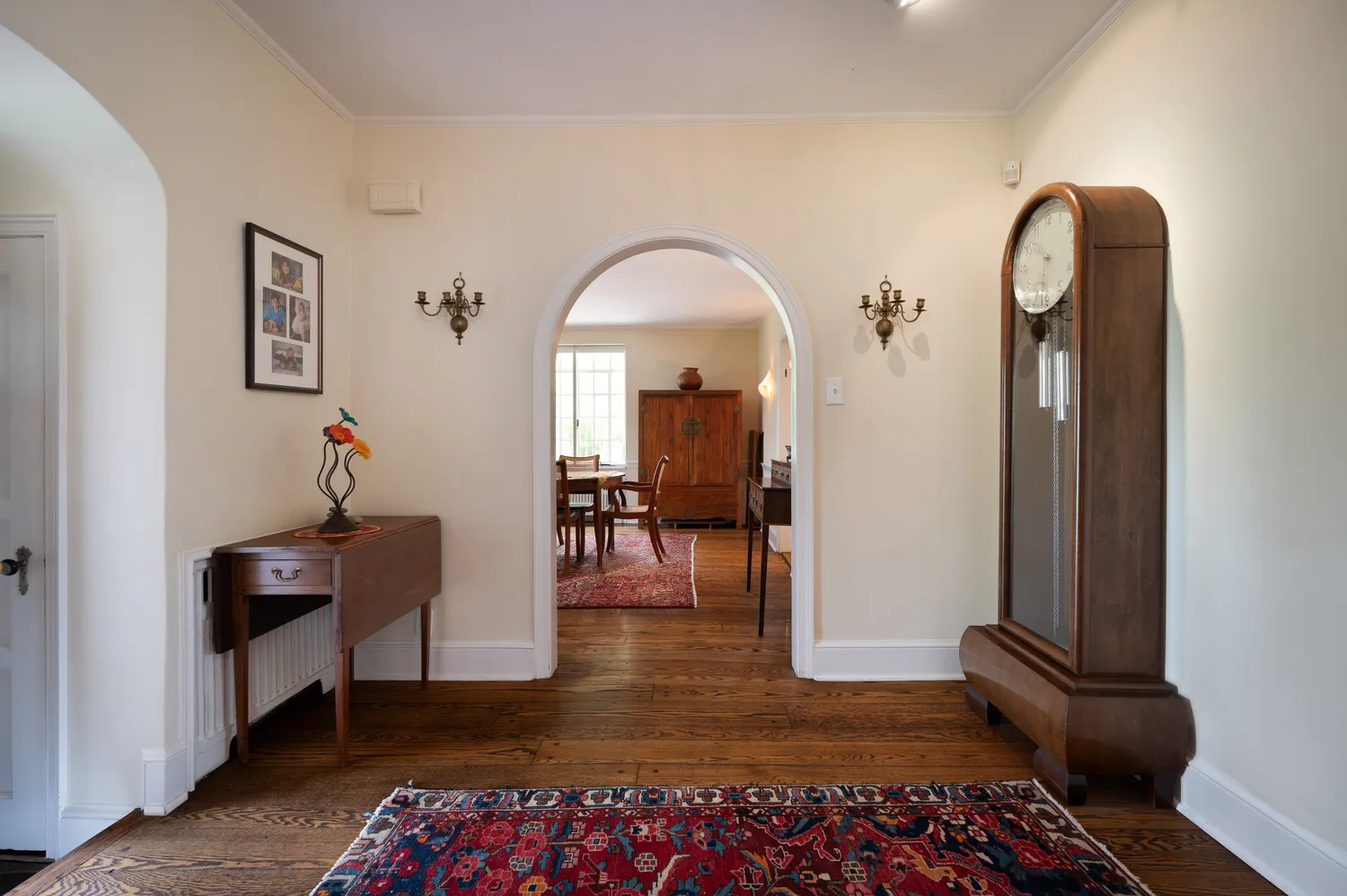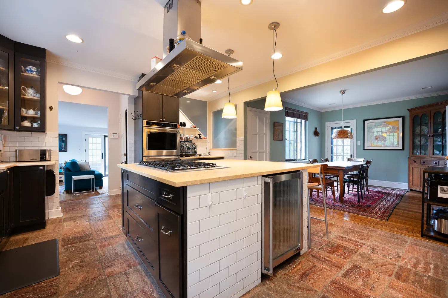 The home offers a gracious and intuitive flow across its spacious layout. Upon entry, you’re welcomed into a warm and inviting foyer. To the left, a sun-filled dining room provides an elegant setting for gatherings and connects seamlessly to the large chef’s kitchen. Accessible from both the dining room and foyer, the kitchen is designed for both function and connection, featuring a generous square granite island, gas cooktop with powerful hood, and ample space for casual dining.