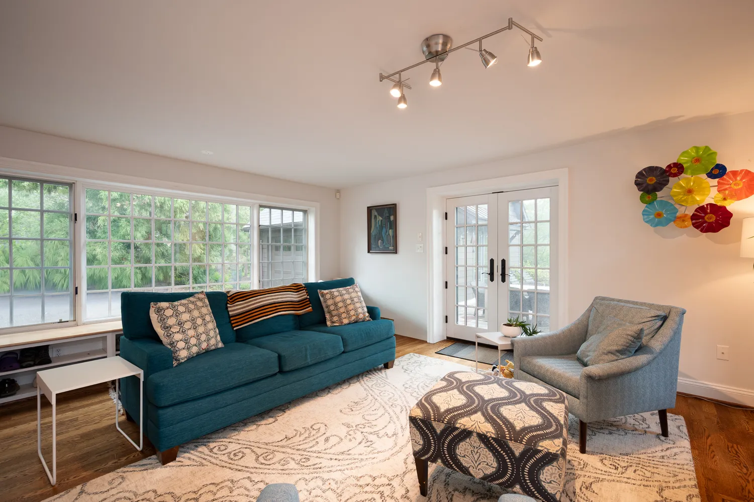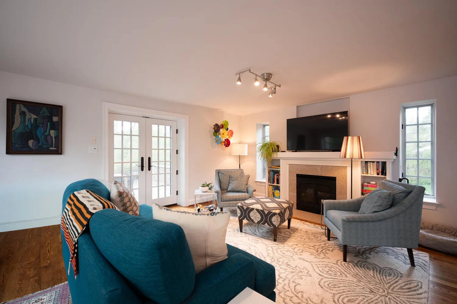 Just beyond, a side entrance leads to a practical mudroom and opens into a bright, comfortable family room with a gas fireplace. French doors extend the living space outdoors to a stone patio and provide easy access to the new detached oversized garage.