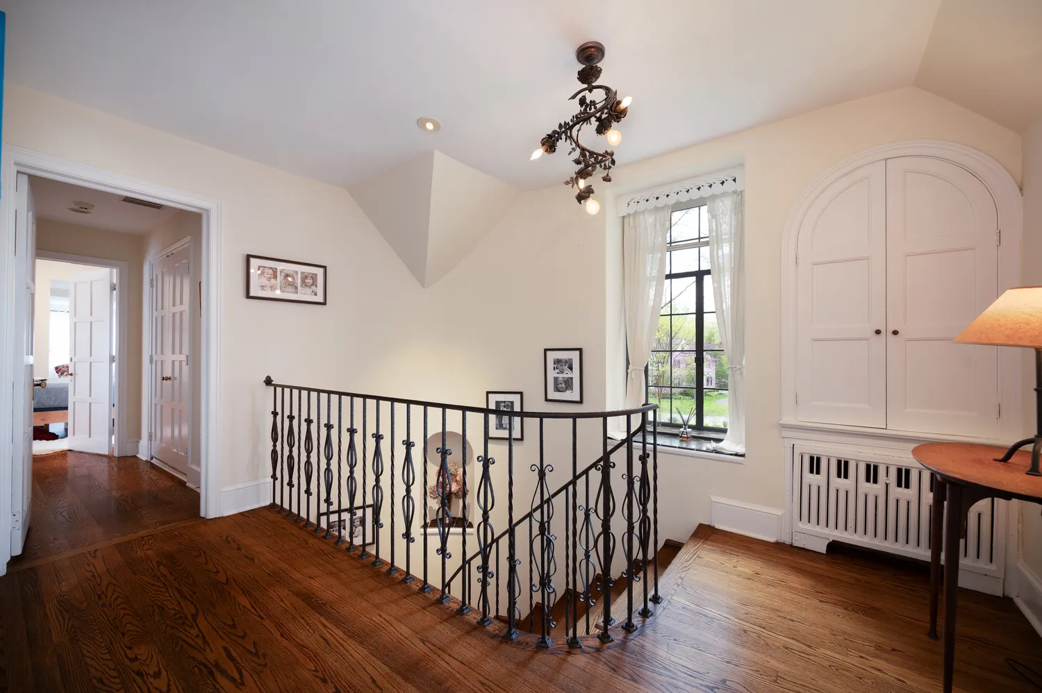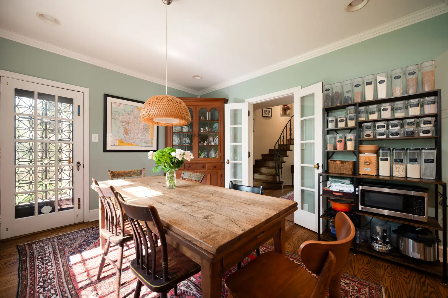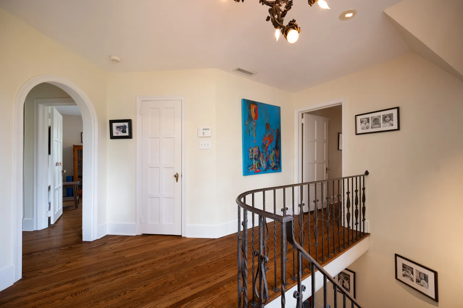 Upstairs, the curved staircase—accented by its stunning original wrought iron railing—leads to five bedrooms. One wing includes three bedrooms, two of which are connected by a shared bath, along with an additional updated en-suite bathroom. A separate guest suite, accessed via a rear staircase, offers privacy along with its own full bath. On the opposite side, the spacious primary suite features French doors opening to a Juliette balcony, a walk-in closet, and an updated bath with both tub and shower. The laundry room is also conveniently located in this wing.