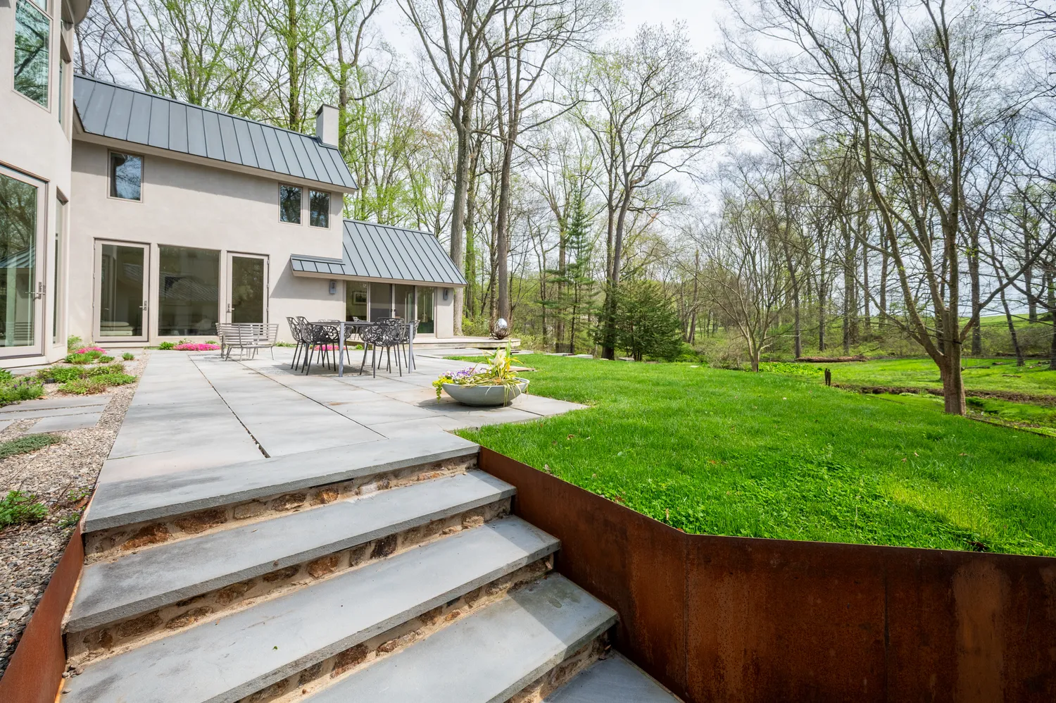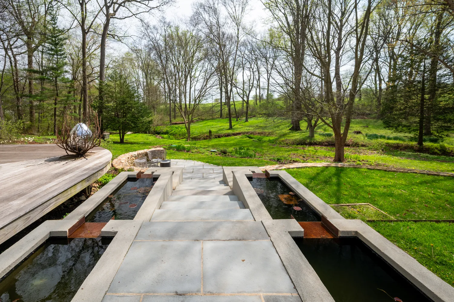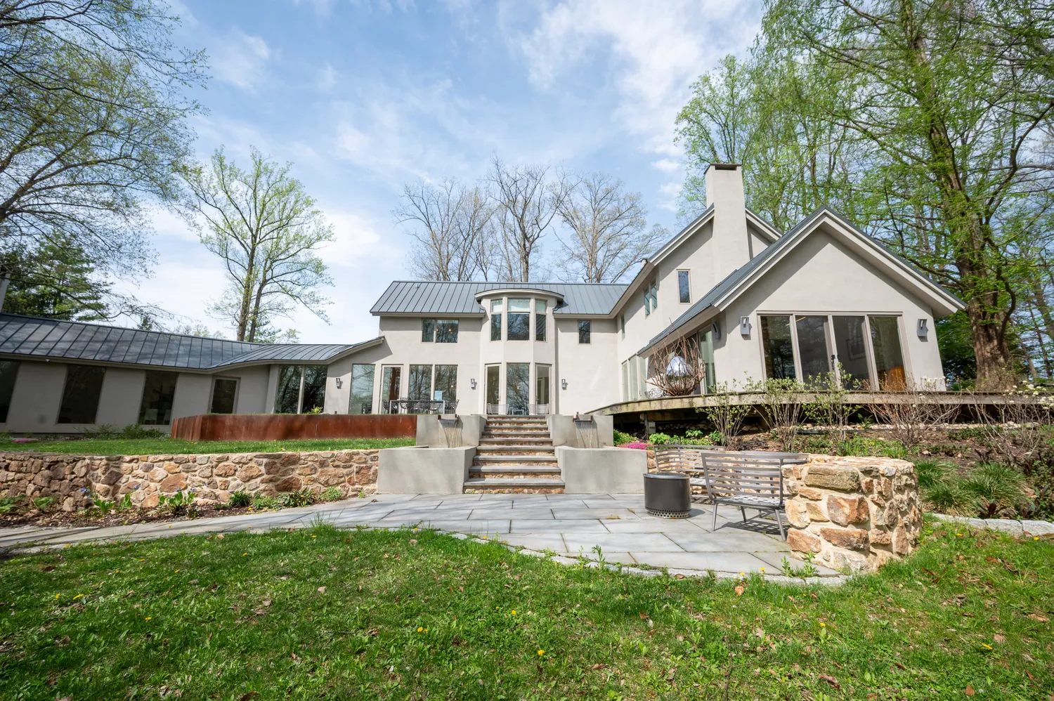Outside, the landscape unfolds as its own work of art. Designed by the owner, GreenWeaver Landscapes and Pinwheel Landscaping in 2022, the grounds are sculpted with Corten steel and Pennsylvania bluestone forming patios, pathways, and terraces that feel organic to the land. Waterfalls trace their way down stone steps into a naturalized garden where structure gives way to softness. Planted with care but never rigidity, the garden invites wandering, observation, and a sense of quiet discovery.