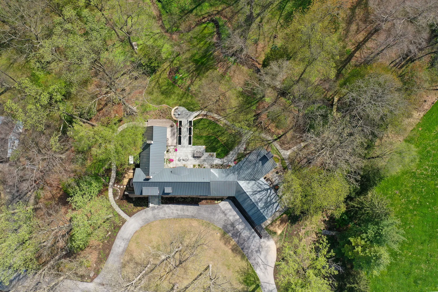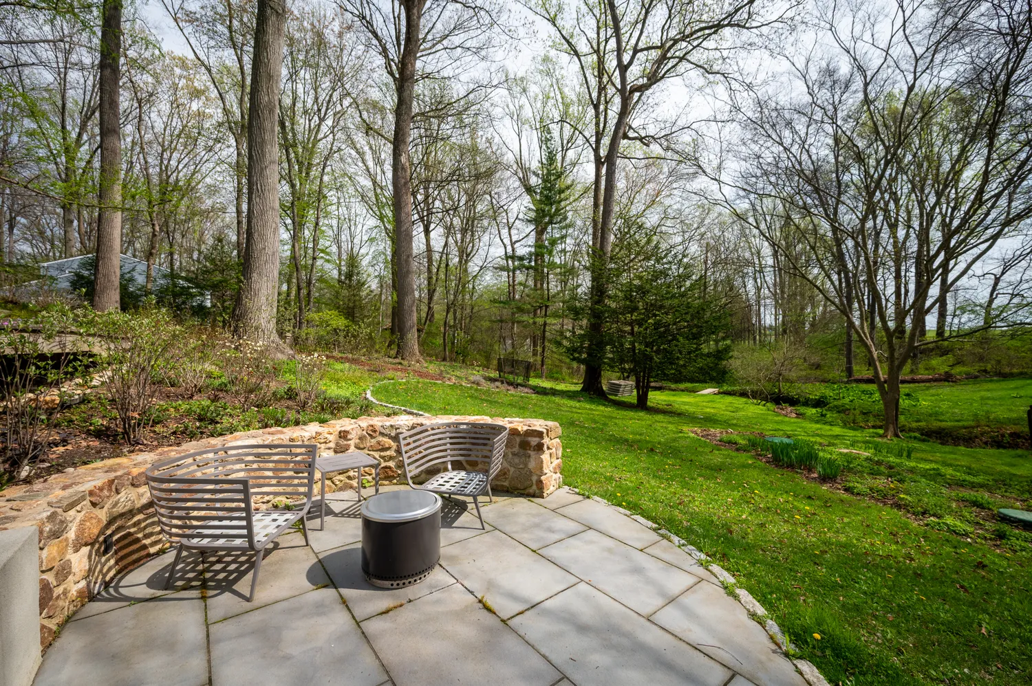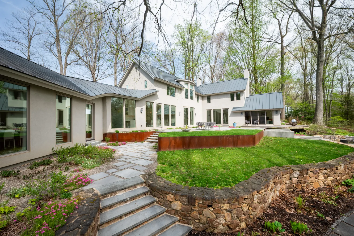 Outside, the landscape unfolds as its own work of art. Designed by the owner, GreenWeaver Landscapes and Pinwheel Landscaping in 2022, the grounds are sculpted with Corten steel and Pennsylvania bluestone forming patios, pathways, and terraces that feel organic to the land. Waterfalls trace their way down stone steps into a naturalized garden where structure gives way to softness. Planted with care but never rigidity, the garden invites wandering, observation, and a sense of quiet discovery.