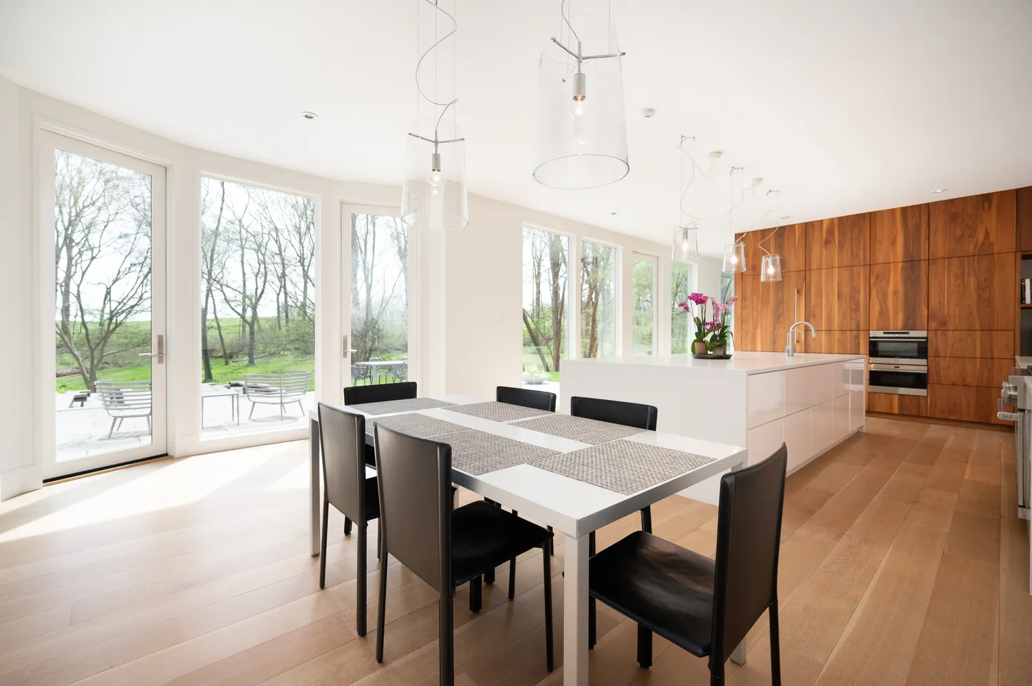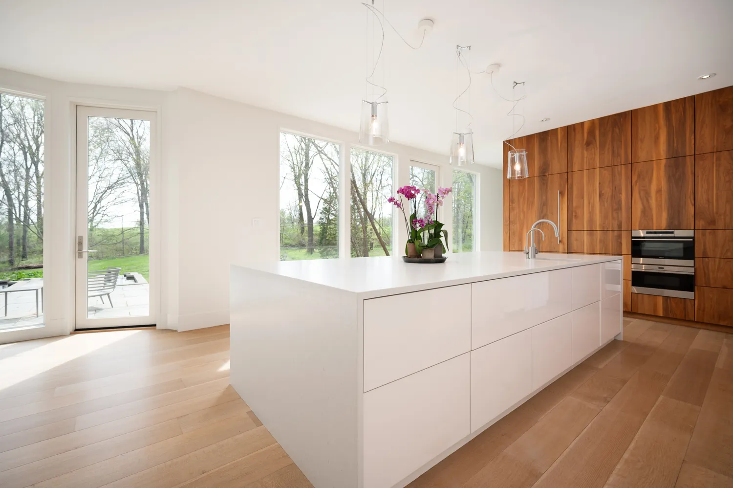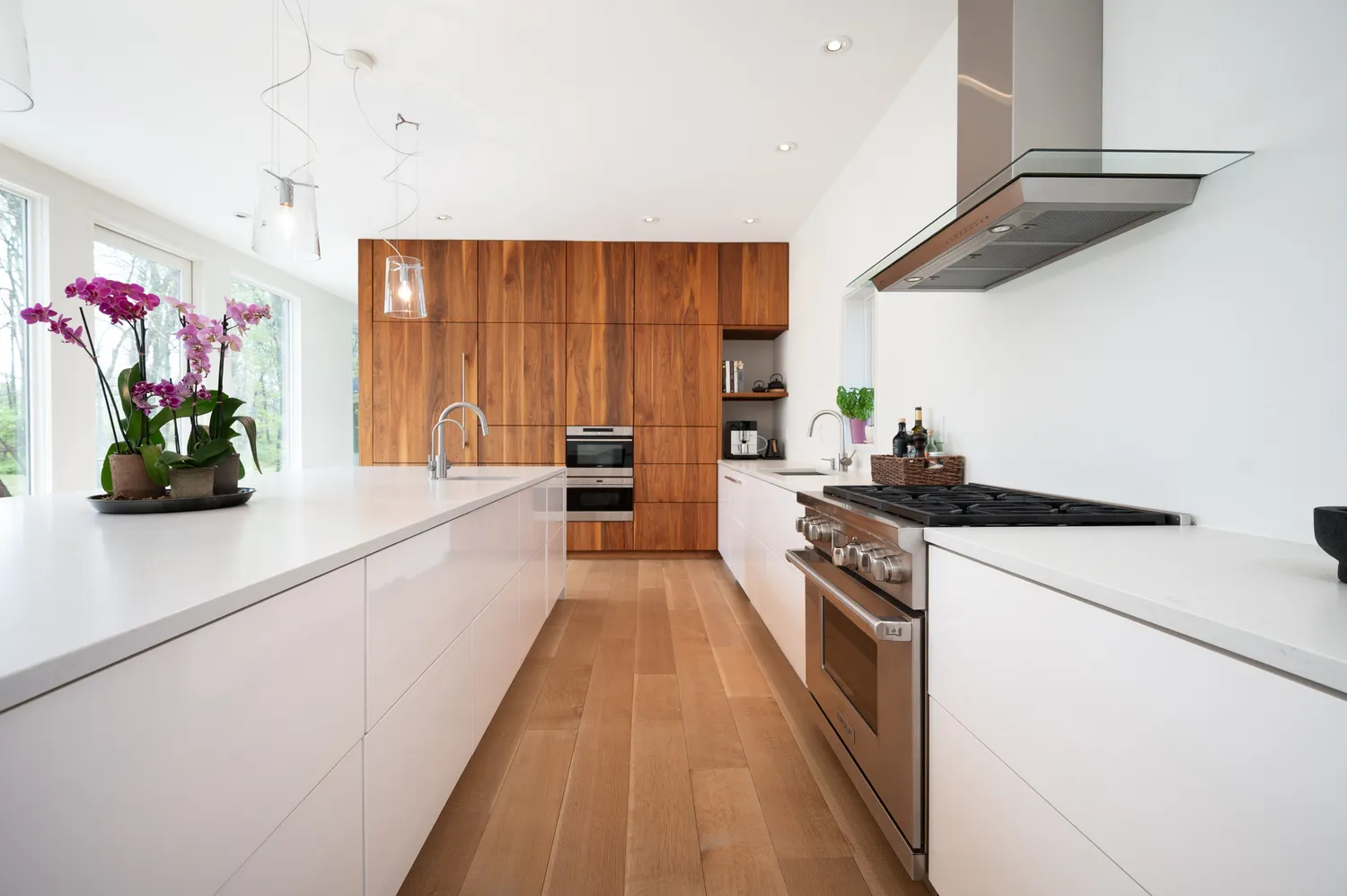 At the heart of the home, the kitchen unfolds as both anchor and gathering place. It is where life naturally converges—generous in scale, thoughtful in function, and seamlessly connected to the spaces around it. Custom walnut cabinetry, designed by the owners, brings a richness and depth that feels both grounded and refined, striking a balance between warmth and restraint. Underfoot, Carlisle white oak floors lend a quiet authenticity, complemented by Caesarstone Quartz surfaces that add texture and permanence. Four wood-burning fireplaces introduce a sense of ritual and comfort. Every detail—from Wolf and Sub-Zero appliances to the butler’s pantry and oversized secondary pantry—supports both everyday living and effortless entertaining.