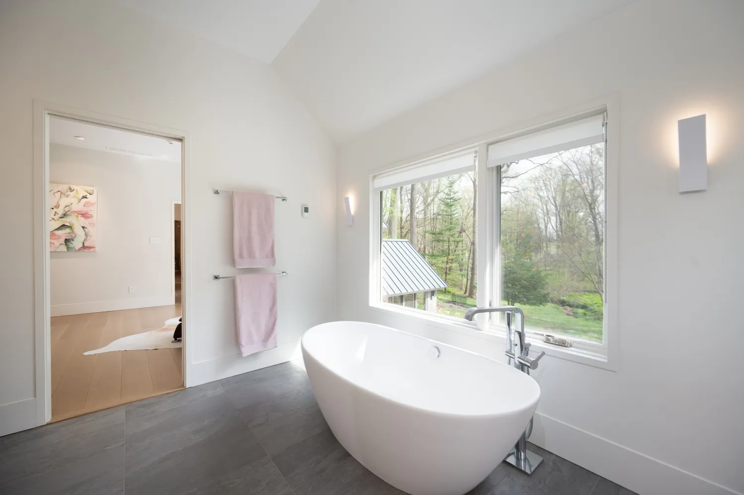 Upstairs, three bedrooms and two full baths continue the home’s calm, cohesive tone. The primary suite feels like a retreat unto itself, with a spacious bath where a soaking tub is positioned to take in garden views—a quiet moment suspended between indoors and out. A walk-in closet completes the suite with both beauty and practicality.