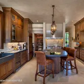 The lower level includes a media room, fitness area, theater, and a stone-lined wine room with tasting space. Rolling meadows and mountain vistas surround the home, creating a peaceful setting minutes from downtown Aspen.