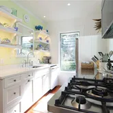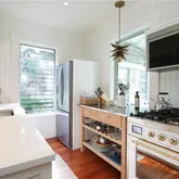 from Italy. White cabinets and backlit open shelving, a stainless-steel work area and a custom hutch complete this very efficient space. The primary bedroom has a king-sized bed, his and her custom closets, an antique