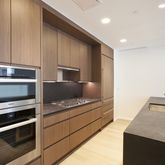 The kitchen features custom stained walnut cabinetry, granite countertops and waterfall island and is equipped with two Miele wall mounted convection ovens, gas cooktop, dishwasher and range hood that vents to the outside. The chef's kitchen is beautifully complimented by a Sub-Zero refrigerator, freezer and wine refrigerator.