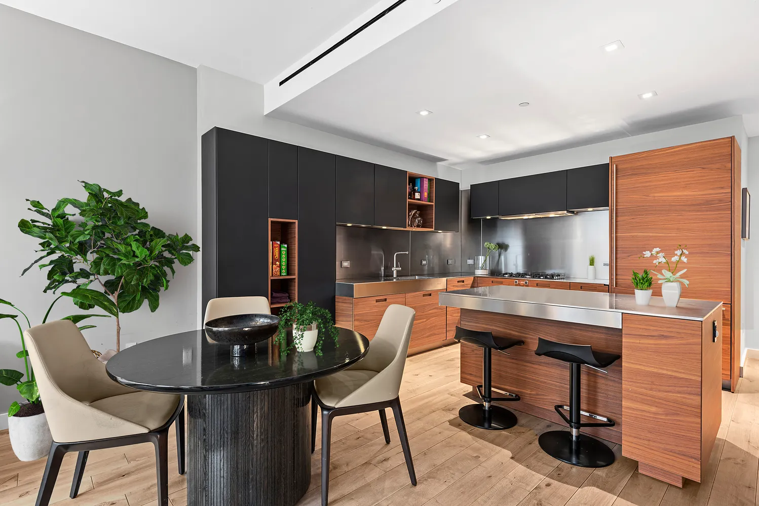 Spanning 1,481 square feet, this bright and airy home welcomes you with 6” wide-plank walnut floors and tall ceilings finished with recessed and designer lighting. A convenient coat closet and chic powder room flank the gracious foyer. Ahead, the great room invites you to relax and entertain alongside 8-foot-tall tilt-and-turn East facing windows. The exquisite Poliform kitchen combines form and function with dazzling walnut cabinets topped with stainless steel countertops and backsplashes. Upscale appliances by Miele, Sub-Zero and Dacor include a gas cooktop, oven, refrigerator, microwave drawer and wine refrigerator. Dark cabinet fronts and open shelving add visual intrigue, while the center island provides convenient counter seating.