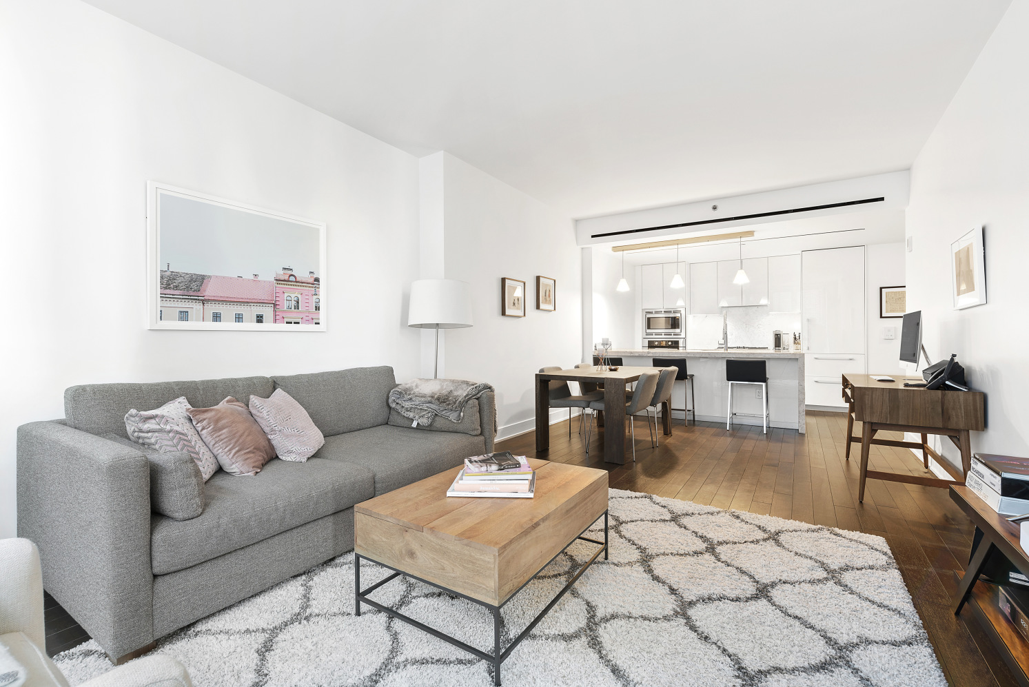 Centrally-located, yet discreet and quiet, 5 Franklin Place offers a full time doorman and concierge, a landscaped roof deck and pool, a brand new, state of the art gym, bicycle storage, and childrens playroom. Just a short distance from acclaimed restaurants and nightlife like Brandy Library, Walkers, Batard, Petrarca Cucina e Vino, Baked, and M1-5 Lounge, while also conveniently located to 1, N/R/Q/W, A/C/E, 6, and J/Z subway stations, this apartment could not be more optimally located for a full New York City lifestyle and quick transportation.