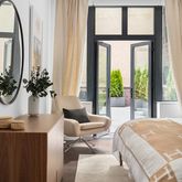 The impressive master suite features direct access to your private patio, a massive walk-in closet and electronic black out shades. A luxurious en-suite master bathroom has radiant heated terrazzo flooring from Italy, a Not Only White double sink basin from the Netherlands with wall mounted Atrio Grohe faucets, Miton Cucine vanity and medicine cabinet, and a sleek thermostatic controlled Grohe rain shower with a high-pressure hand spray faucet. The second bedroom features generous storage and ready-equipped blackout shades. Across the hallway is the second full bathroom with deep medicine cabinets and Grohe fixtures.