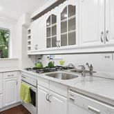 The bright kitchen has a view of the park as well. Apartment finishes include elegant mouldings and parquet floors.