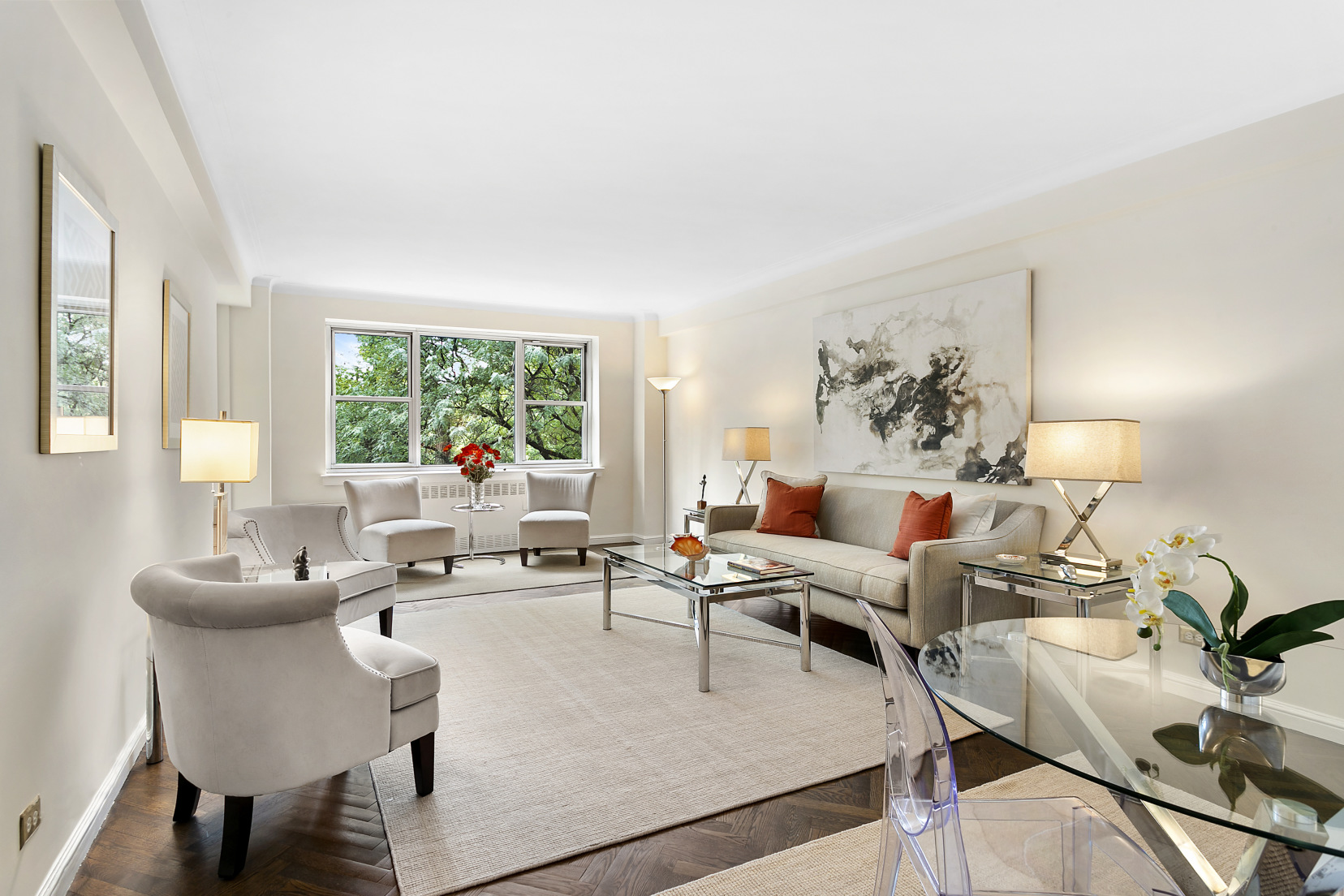 Large windows in all rooms frame direct views into Central Park, and during the day, the apartment is flooded with natural light and views of the trees and greenery. Views through trees to the boat pond with park access at 72nd St.