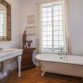 The second floor of the house is entirely dedicated to the master suite, and boasts 10ft ceilings, a spacious bedroom, two windows plus an arched sitting area. There is also a generous dressing area that transitions into the master bathroom. The master bath has a sculptural claw foot tub with Pegler hardware, with a magnificant dreamy window that carries the leafy views and light in. Cesame console sink completes the Belle Époque style of this room. Additional subway tile encased shower.
