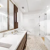 The stately primary suite boasts sunny southern exposure and tree top views, with generous walk in closet. An ensuite five fixer marble bath features a double vanity, Waterworks fixtures and chic Calacatta Gold mosaic floors. The secondary bedroom is also very spacious can easily fit king size bedroom, also with an en suite bathroom with limestone floors and an oversized shower.