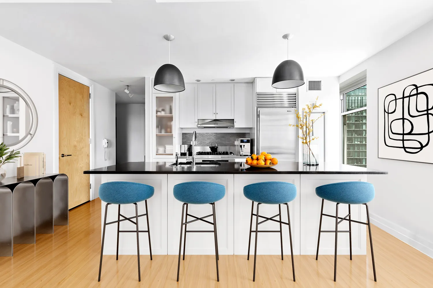 The kitchen is a chef’s dream with a Viking Stove, Subzero refrigerator, Bosch dishwasher, oversized granite island countertops, and custom cabinetry. The living room allows for an array of configurations...A rare find, 110 Livingston’s newest residence 7O, is a stunningly renovated 2BR/2BA exceptional home that will take your breath away! A highly sought-after corner unit with southeast exposure. You’ll be mesmerized by the amount of natural light and amazing city views that flow through this luxury residence.