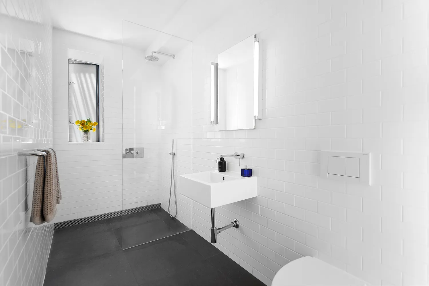 Both bedrooms enjoy ample custom designed closets, pocket-door privacy and beautiful daylight. The oversized, luxury spa-like bathrooms showcase AFNY fixtures and are true oases. The primary en-suite bath has heated stone floors and a deep soaking tub. The windowed secondary bath features an overhead luxe rain shower.