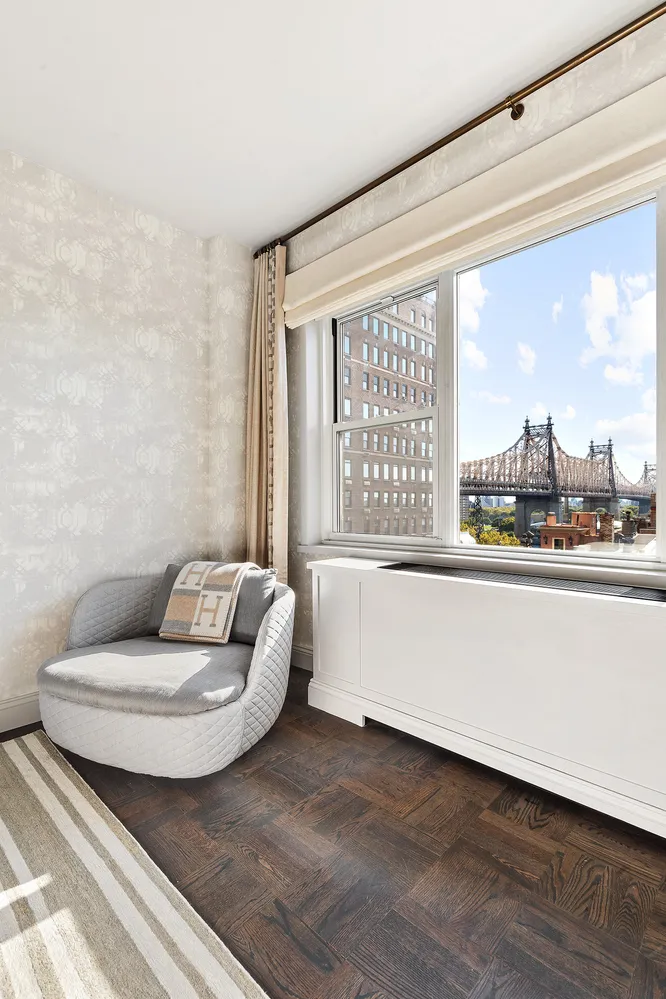 An entry foyer leads to the loft-like corner living room with double exposures and absolutely breathtaking eastern views of the river and Queensboro Bridge. Sun streams into the living room in the morning over the charming townhouses across the way.
