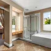 - Room Bathroom Features: Bathtub, Shower, Shower in Tub, Corian Counters, Double sinks in bath(s), Double Sinks in Primary Bath, Exhaust fan(s), Privacy toilet door, Separate tub and shower, Soaking Tub, Tile Counters, Upgraded, Vanity area, Walk-in shower
