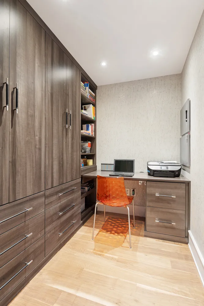 Down the center hall you will find the coveted in unit washer and dryer, three large bedrooms, one of which is currently being used as a home gym and a separate home office with custom millwork (possibility to convert to a 3rd bath with board approval). The primary bedroom has two closets, one of which is a walk-in, and a renovated ensuite bathroom with double sink Corian vanity, a walk-in shower, Grohe fixtures, and radiant heated floors. The renovated second bathroom has a deep soaking tub, top of the line fixtures and also has radiant heated floors.