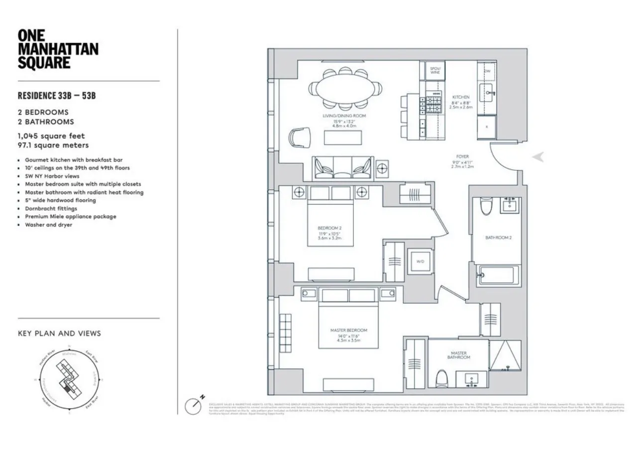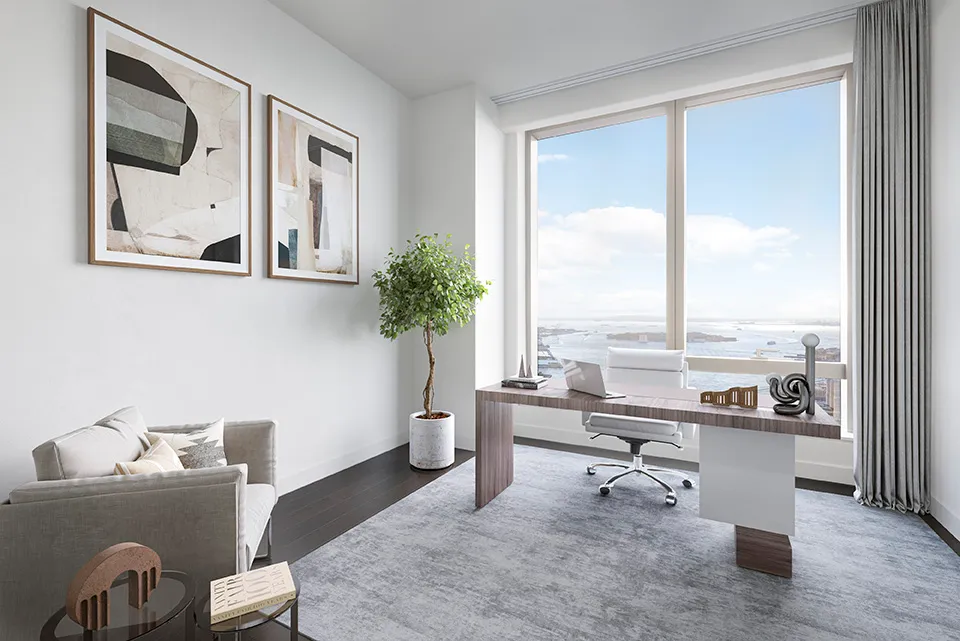 An open gourmet kitchen with premium Miele appliances and custom cabinetry look onto a breakfast bar and the adjacent living/dining area with a floor to ceiling window. The spacious principal bedroom features a stunning ensuite bathroom with custom wood cabinetry, Dornbracht polished chrome fixtures, marble tile walls and radiant heat flooring. A second bedroom boasts floor-to-ceiling windows with a beautiful New York harbor view, as well as ample closet space and an adjacent full bathroom. Spectacular sunset views, 5” wide stained Oak flooring throughout and an enclosed washer and dryer round out this gorgeous home.