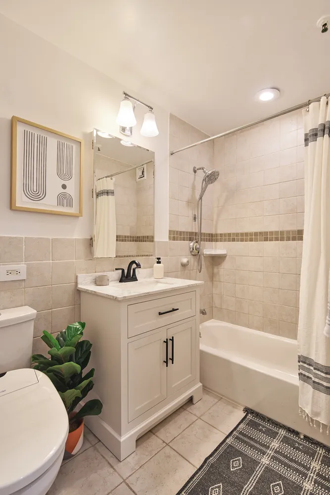 As you walk toward the bedroom, you’ll find a nicely-sized updated bathroom with a luxury toilet and new vanity. Leave your storage worries behind with 4B’s two large hall closets and a massive walk-in closet in the bedroom, which easily accommodates a king sized bed plus furniture.