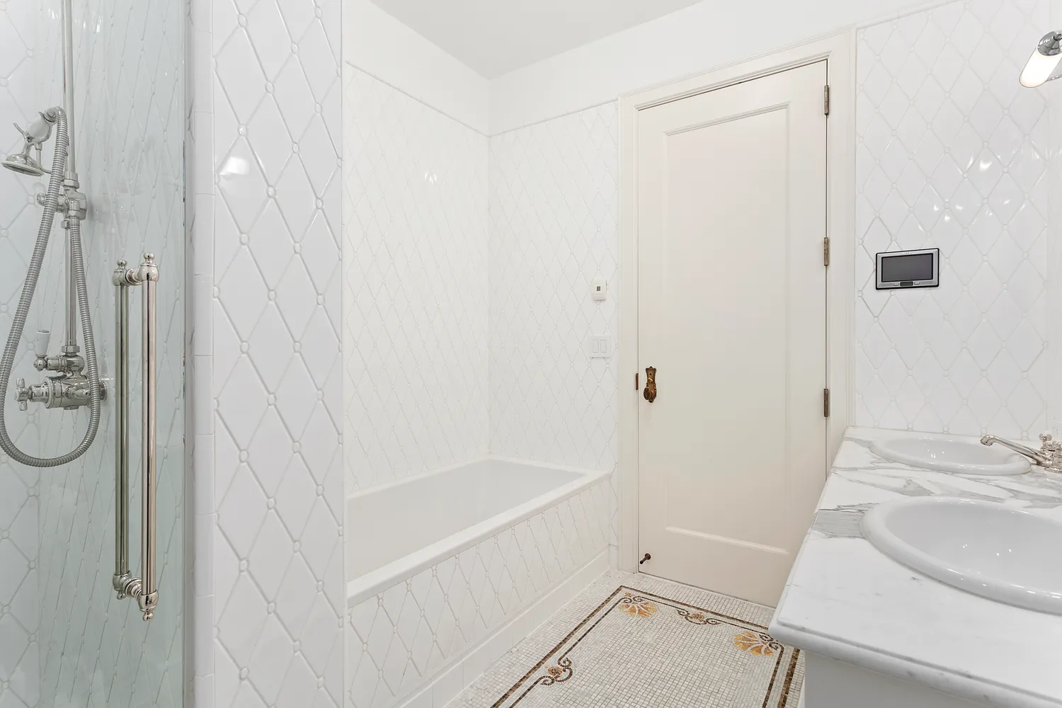 The luxurious primary bathroom is a true masterpiece, boasting double sinks, a separate shower stall, a soaking tub, and an original marble mosaic pattern inspired by the historic Plaza lobbies.