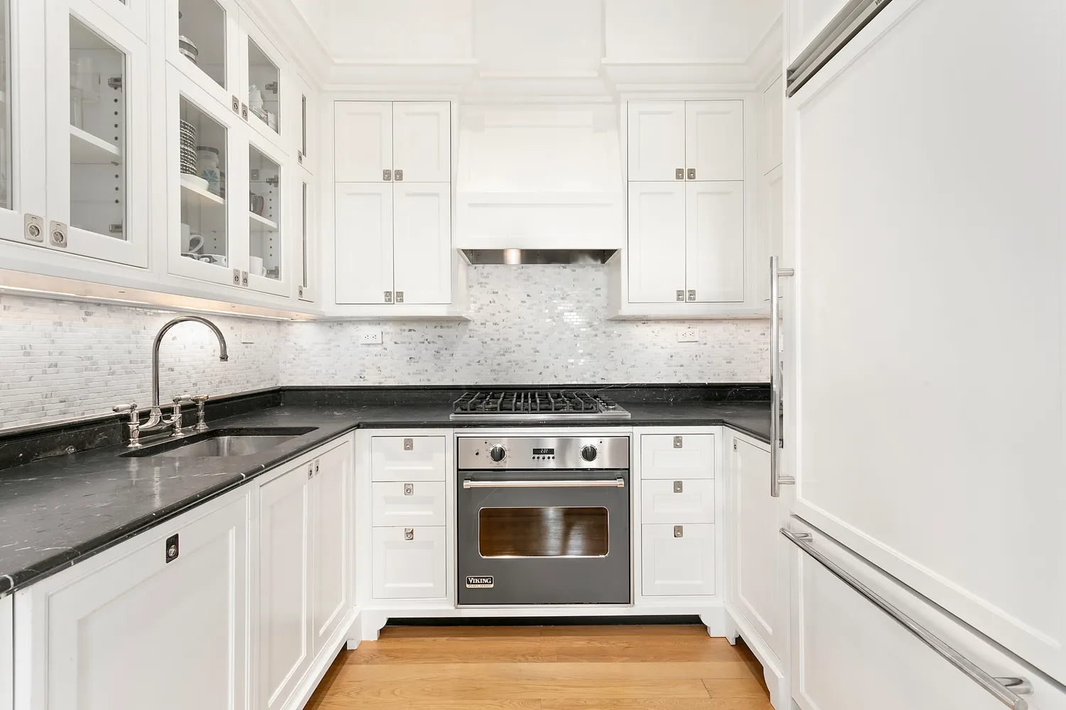 The kitchen is a chef's dream, featuring custom Nero Marquina stone countertops, a Calacatta white mosaic marble backsplash, and top-of-the-line Plaza Collection appliances by Viking and Miele.