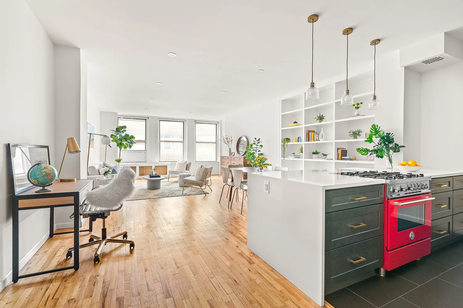 A spacious entry foyer with 3 closets (1 single- and 2 double-width) leads to an expansive and airy living and full dining area – over 25 ft long! – that is highlighted by a stunning opening kitchen featuring striking and ample wood cabinetry, Silestone waterfall countertops with built-in storage on both sides, classic subway tile backsplash, professional Bertazzoni range, LG fridge, dishwasher, and elegant pendant lighting. The space can also easily accommodate a convenient work-from-home area.