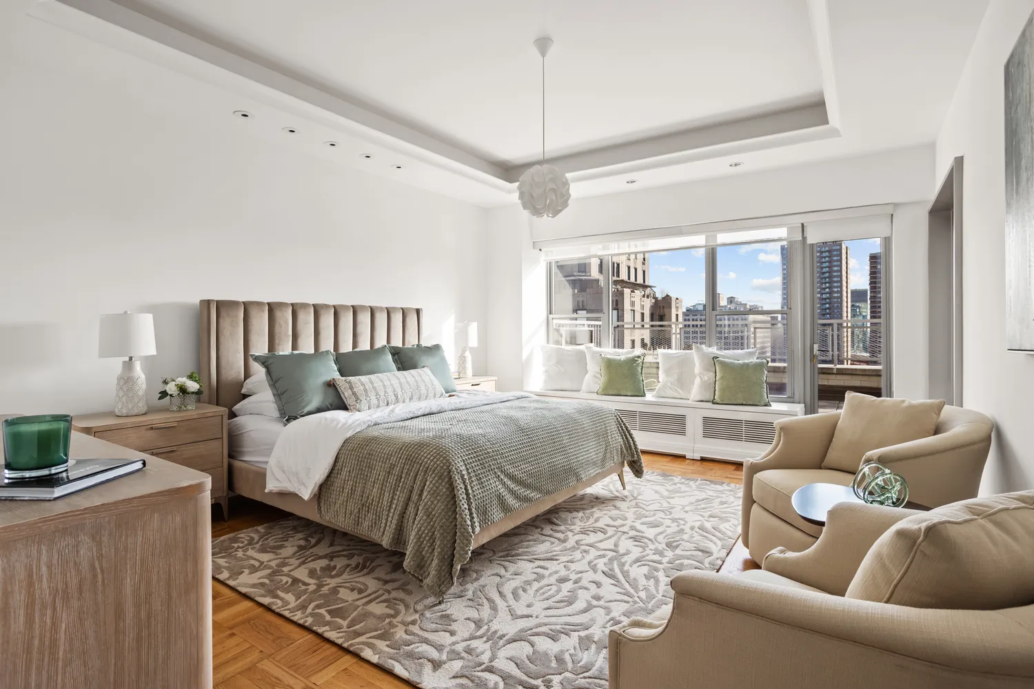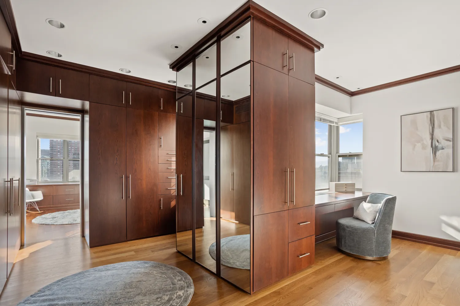 The hallway within the bedroom wing boasts 3 closets, as well as a full bath with bidet and tub, marble countertops, hardwood and tiled flooring with marble saddle, and custom cabinetry. Continue along this hallway featuring corridor ambient lighting and arrive at three bedrooms, plus the independent laundry room, offering a Miele washer/dryer, drying rack, and sink. Although one southeastern-facing bedroom is currently configured as an office/dressing room, 3 separate bedrooms can be seamlessly created within this wing, merely by adding another hallway (see alternate floorplan). Numerous custom-built dark hardwood outfitted closets with brushed nickel hardware, as well as a built-in desk and drawers fill this room. The adjacent second bedroom also boasts southeastern exposures. The spacious east-facing primary bedroom is replete with a cove ceiling, tremendous charm, recessed lighting, and yet another expansive terrace (with views of The Empire State Building), accessed directly from this magnificent room. The primary bath boasts slate flooring, as well as slate shower tiling, rainfall and handheld shower head options, marble countertops, a seated vanity area, and a white subway-tiled backsplash. Some additional features of this lovely home include full city views, central air in the bedroom wing (through the wall in other rooms), and hardwood flooring throughout most of this grand home.
