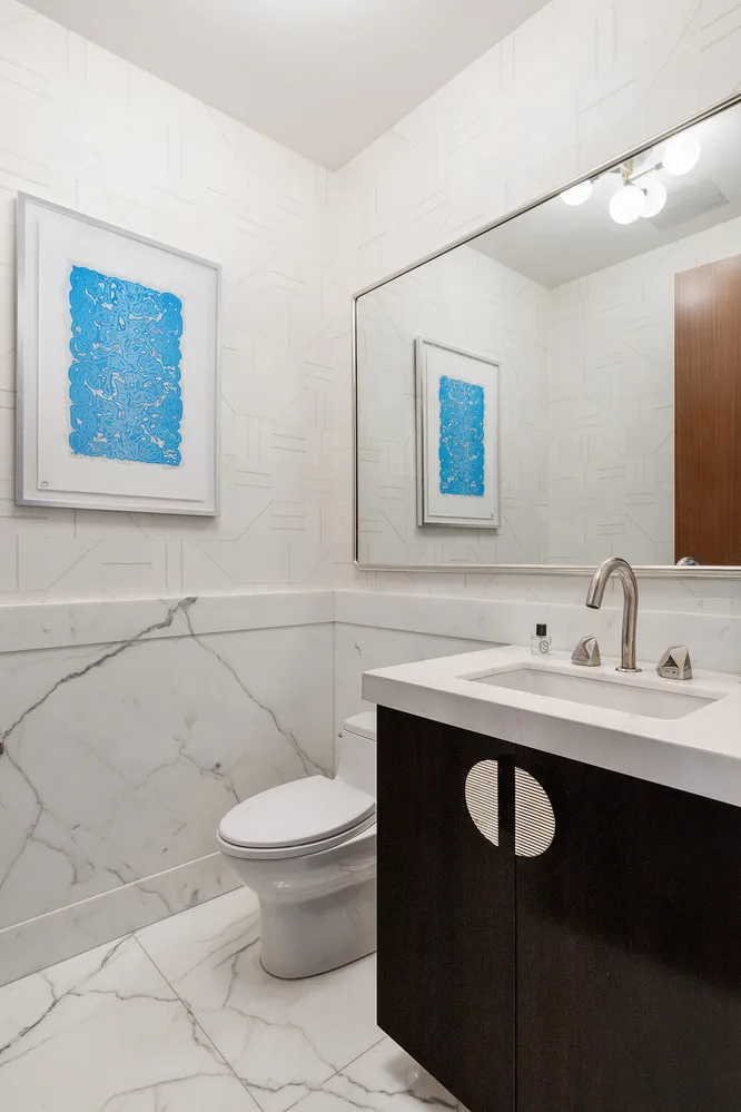 The renovated kitchen features custom cabinetry, polished stone countertops, and top-of-the-line appliances, including a vented-out Wolf Professional gas cooktop and built-in Gaggenau refrigerator-freezer combo. The spacious bedrooms are each adorned with custom millwork closets and sophisticated en-suite baths clad in Bianco Dolomiti marble with Waterworks fixtures. The primary suite boasts a dressing area and spa-like bath with a walk-in Waterworks shower and custom marble details. This residence also offers an array of modern conveniences, including an integrated drop-down ceiling movie theater system, automated Lutron shade window treatments, Sonos speaker system, and smart home capabilities.