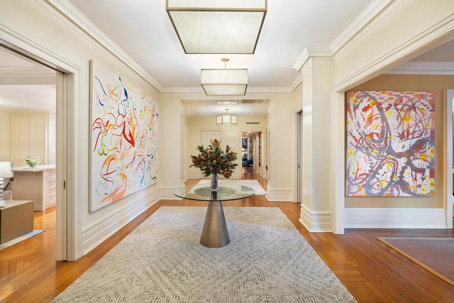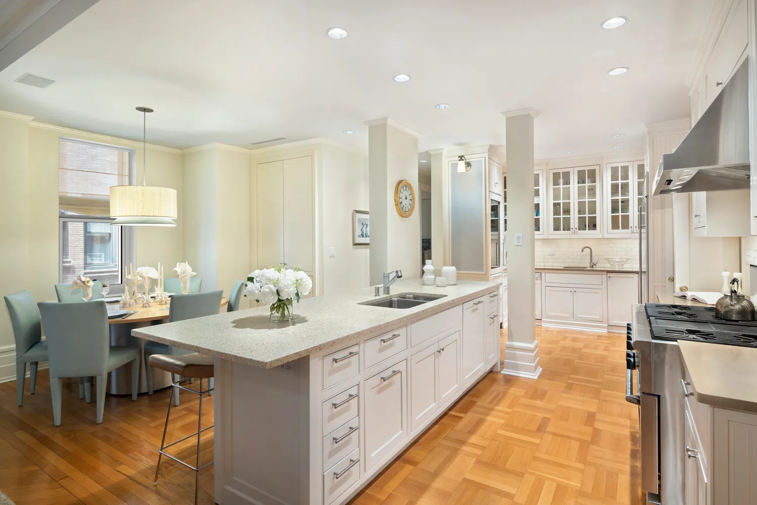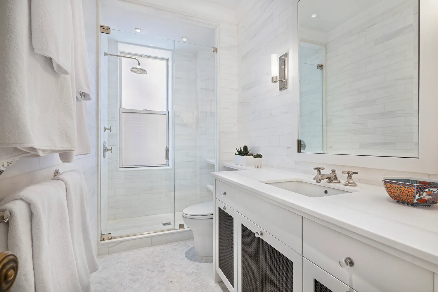 In the southwestern wing, the palatial corner primary bedroom is a quiet yet sun-filled oasis with a spa-like windowed white marbled bath and complimentary separate windowed half bath plus generous closets. Offering unique flexibility, adjacent to the primary suite is a charming sun-flooded guest bedroom, ideal as a nursery or dressing room.