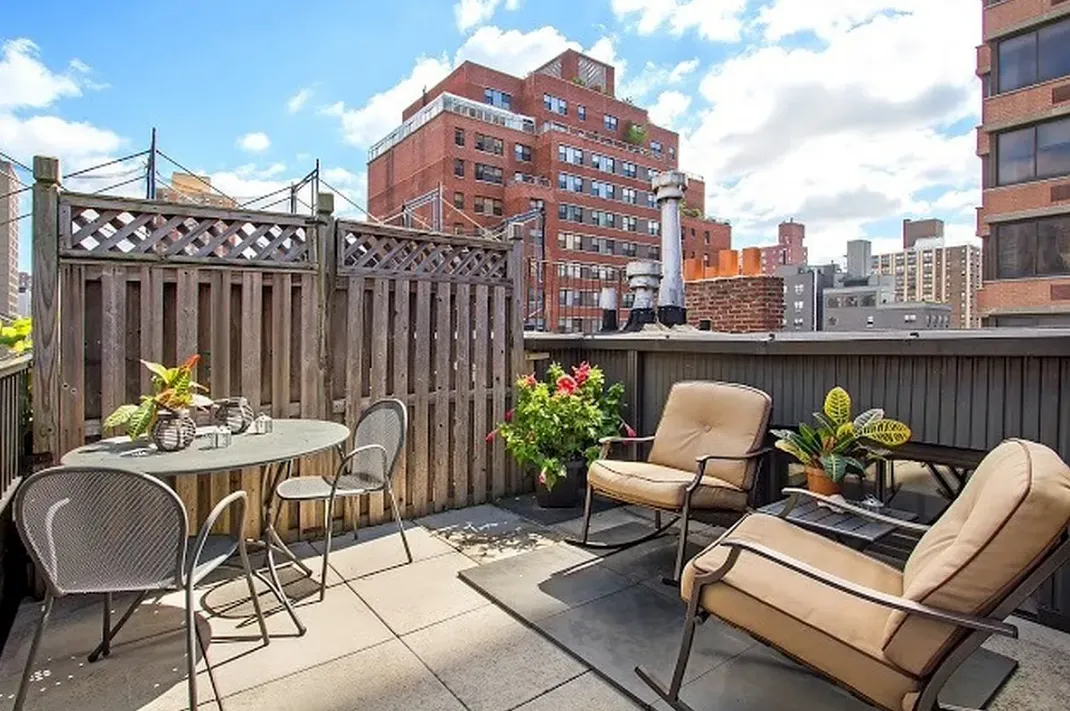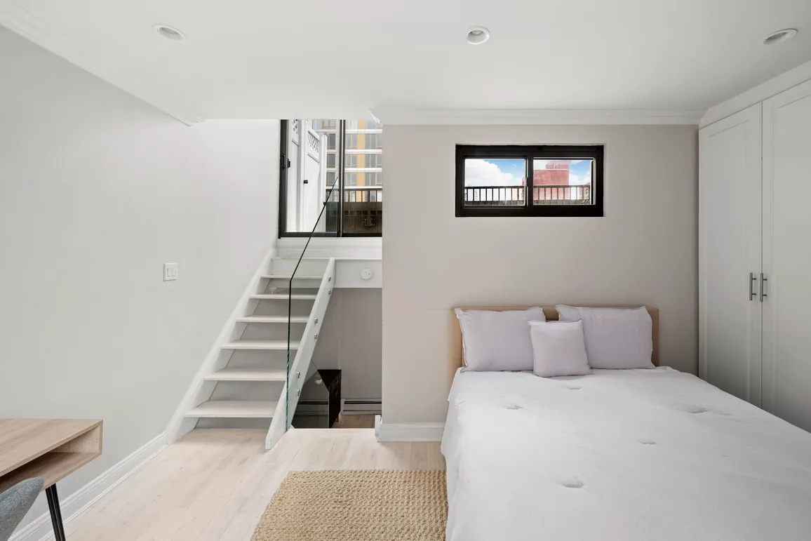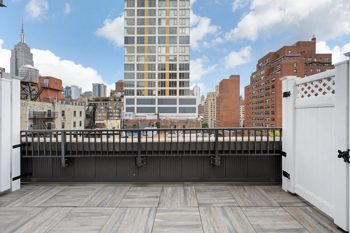 Nestled in the heart of the city, this modern 1-bedroom, 1-bathroom triplex offers a private roof terrace with panoramic views, featuring landmarks like the Empire State Building and also a private balcony. Its dual south and north exposure ensures a bright and airy space.