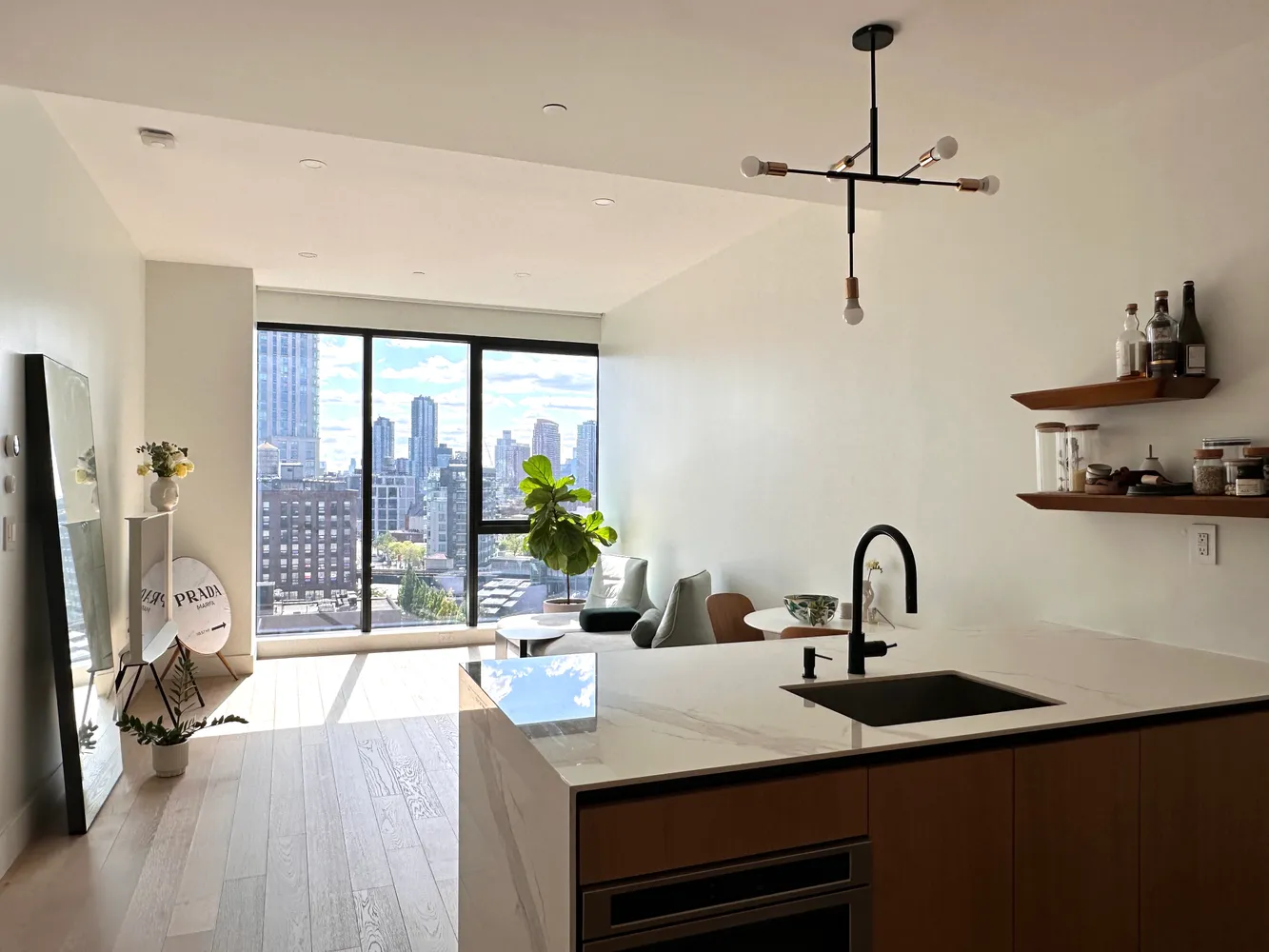 The open-concept living, dining, and kitchen area is flooded with southern and western sunlight, thanks to the triple-pane floor-to-ceiling windows and 10-foot ceilings. The kitchen boasts an eat-in island, custom oak cabinets, marble-look countertops and backsplash, and top-of-the-line Bosch appliances.