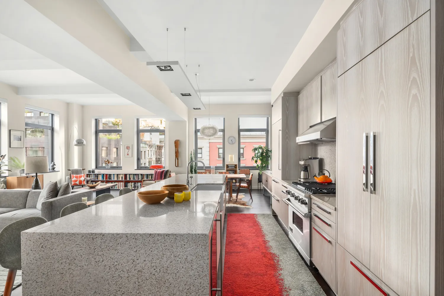 Thoughtful & sophisticated custom design permeates every aspect of this apartment. Starting with the heart of the home, the open kitchen is outfitted with custom gray oak millwork and cabinetry by Malteni/Dada. This space is perfect for in-home dining as well as entertaining, as it boasts a massive marble island with oversized farmhouse sink, as well as high-end appliances by Viking, Subzero, and Miele, along with built-in wine storage.