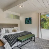 Off the living room is the master suite that includes a newly remodeled bathroom featuring Ann Sacks limestone tile and a luxurious jetted soaking tub. The master bedroom and living room open to the outdoor patio with double Fleetwood sliding doors.
