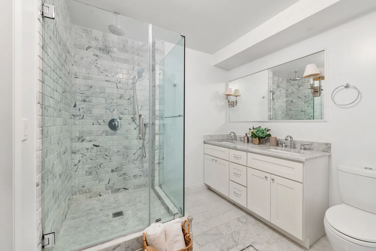 Down the hall are the two spacious bedrooms, each the size of a large primary bedroom and featuring an impressive amount of closet space—perfect for all your storage needs. Both bathrooms showcase exquisite Carrara marble tiles, creating a spa-like atmosphere. The oversized en-suite primary bathroom is a true retreat, complete with a double sink vanity and a luxurious step-in rain shower, perfect for unwinding after a long day.