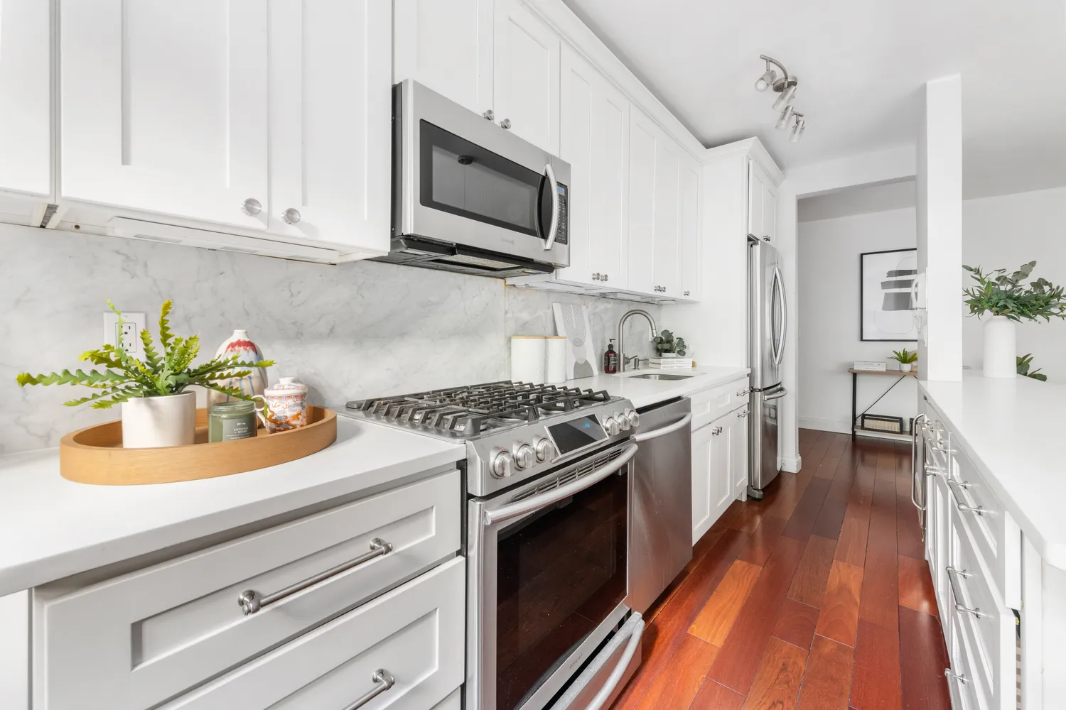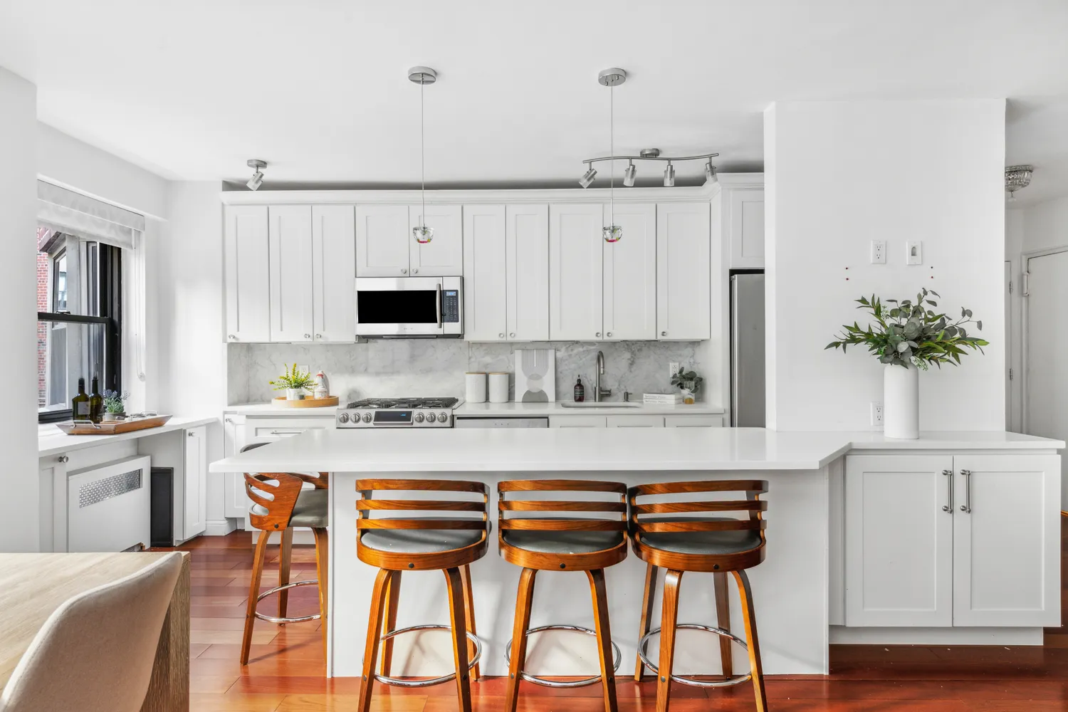 The renovated, windowed kitchen is a chef’s delight, featuring an expansive island for entertaining. Enjoy cooking with high-end stainless steel appliances, sleek quartz countertops, and a stunning Carrara marble backsplash that adds a touch of luxury. And for wine lovers, the built-in wine fridge is a must-have!