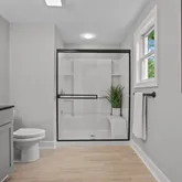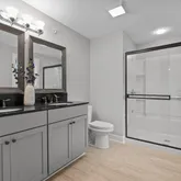 En-suite bathroom with double vanity, frameless glass shower, and elegant finishes