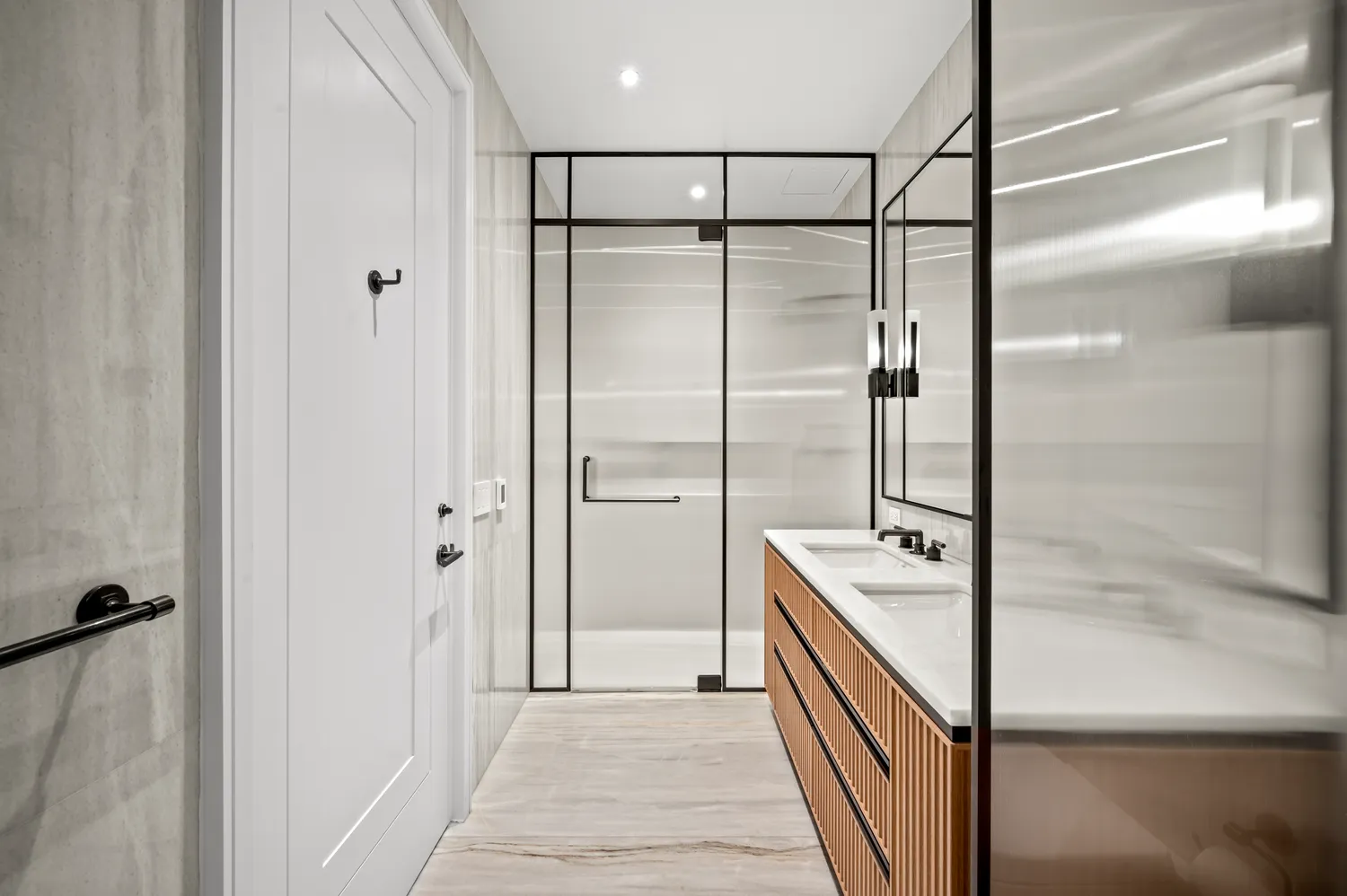 The primary suite is a serene retreat, boasting a walk-in closet and a spa-like en-suite bathroom. Here, you’ll find Nestos Beige marble slabs on the floors and walls, Polished Opal White marble countertops, and a custom vanity illuminated by bronze-finished sconces and fluted mirror panels. A wall-mounted Toto toilet and radiant heated floors provide added luxury.