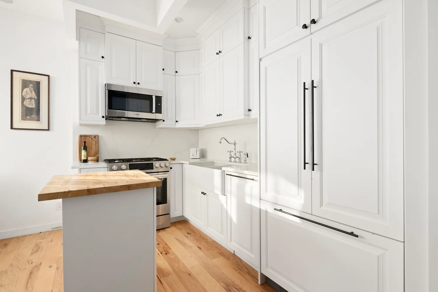 Step inside to a grand entrance leading to the heart of your home. The open-concept kitchen and living area boasts a wall of expansive casement windows that flood the space with natural light. An exposed white brick wall adds a sleek, modern touch, while the thoughtfully designed corner kitchen makes cooking a delight. Equipped with a butcher block center island, ample cabinet storage, and a farmhouse-style sink, the kitchen is as functional as it is stylish. Integrated Bosch appliances and a Fisher & Paykel refrigerator elevate the space with their seamless, modern design. A cozy dining nook completes this perfect entertaining area.