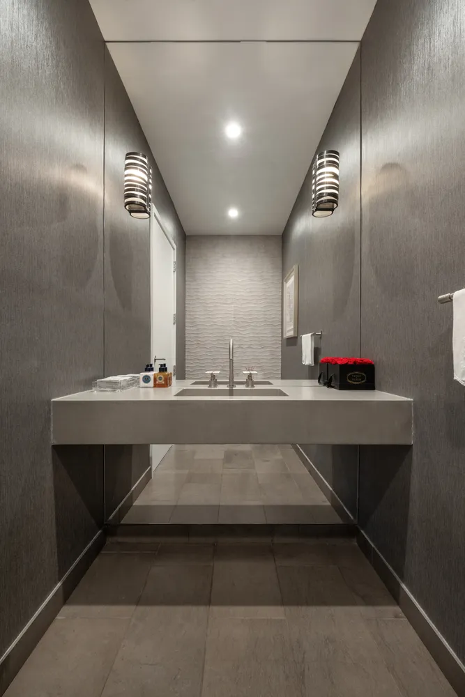 The home’s expansive corner primary suite boasts southern and western exposures with sweeping city views. The serene en-suite primary bath offers a spa-like retreat, featuring Baetig Azul limestone flooring, Saint Louis limestone walls, and a custom stone and teak vanity. A Zuma soaking tub, glass-enclosed shower, and double sinks with Sense by Clodagh 27 fixtures complete the five-fixture bath.