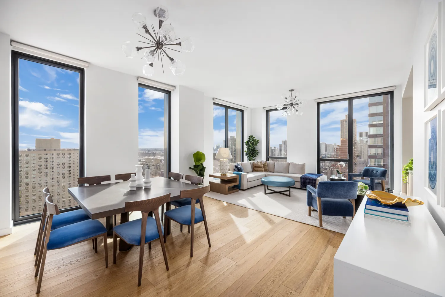 The expansive corner living room, with east and south exposures, is a showcase of light and dynamic views, where each window frames a living work of art. Beautiful custom millwork, smartly designed to maximize space, and custom built-ins throughout elevate both style and practicality, offering ample storage and seamless integration with the home’s design. A dedicated dining area comfortably accommodates seating for eight, perfect for both intimate dinners and grand entertaining.