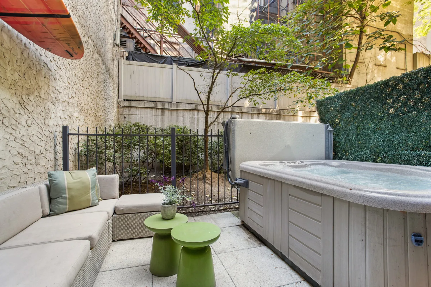 The upper floor of the townhouse faces North and features an open kitchen with stainless steel appliances, dishwasher, garbage disposal, vented microwave and Calacutta Gold marble countertops. The spacious living and dining area is perfect for entertaining guests and leads to a patio with its own private entrance. The bedroom on the upper...This gorgeous two-bedroom duplex maisonette within a luxury condominium has its own private patio and entrance, and its own private outdoor garden with a hot tub!