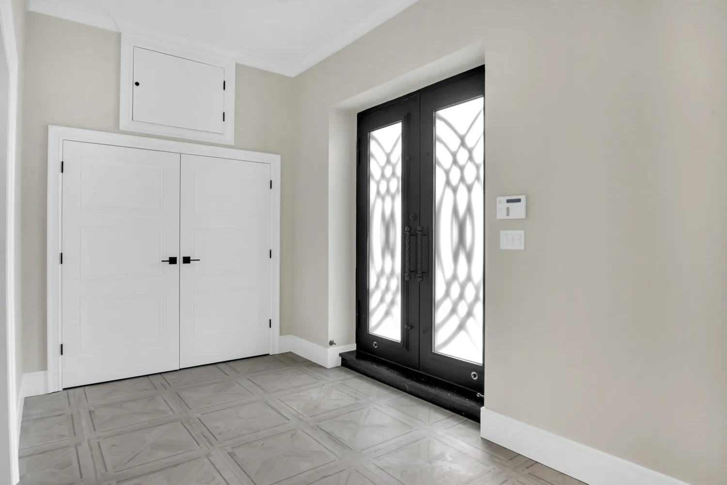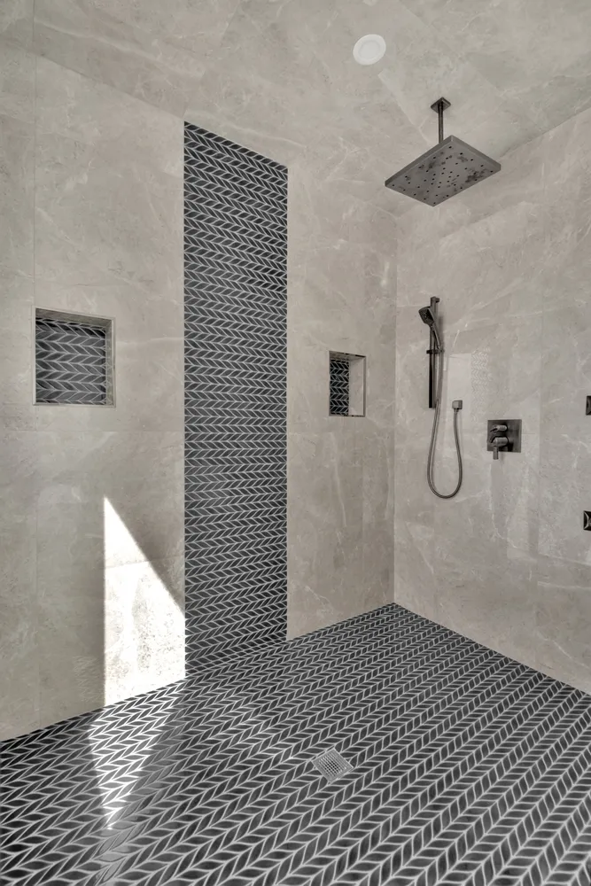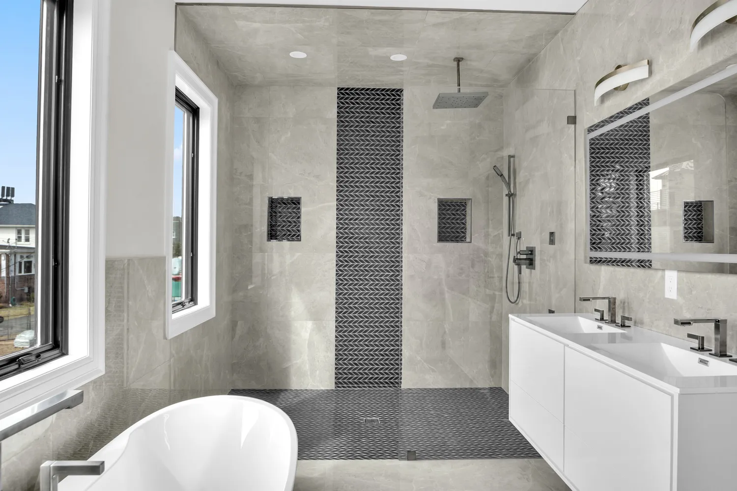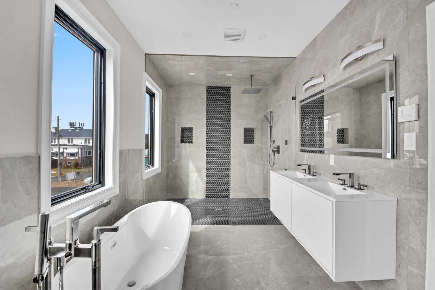 The house is constructed with Everlast Composite siding. This is windproof, waterproof, hail-proof, fadeproof and insect proof. The exterior also constructed of imported stone from Turkey. Permeable pavers throughout the exterior with Belgian Block curbs, garage zipper drains, and custom exterior lighting.